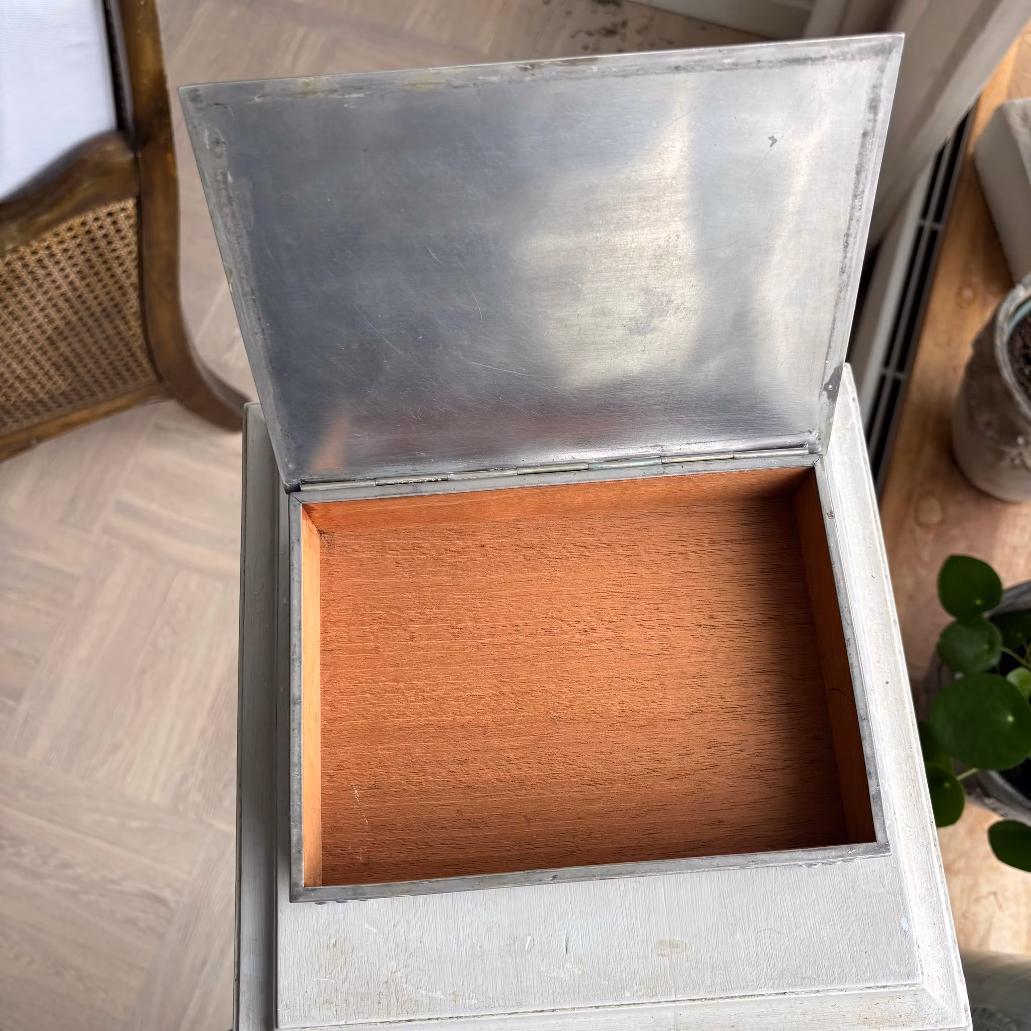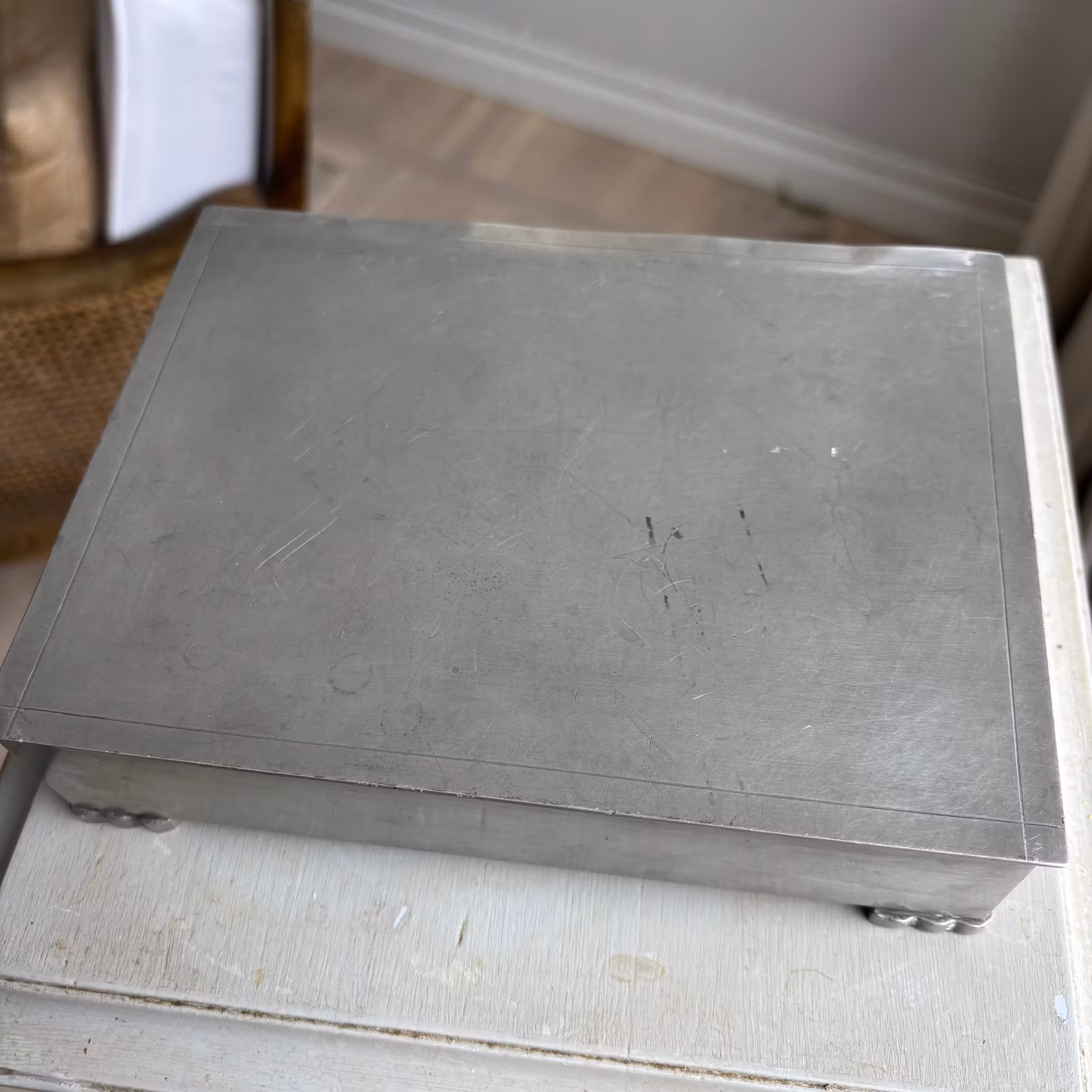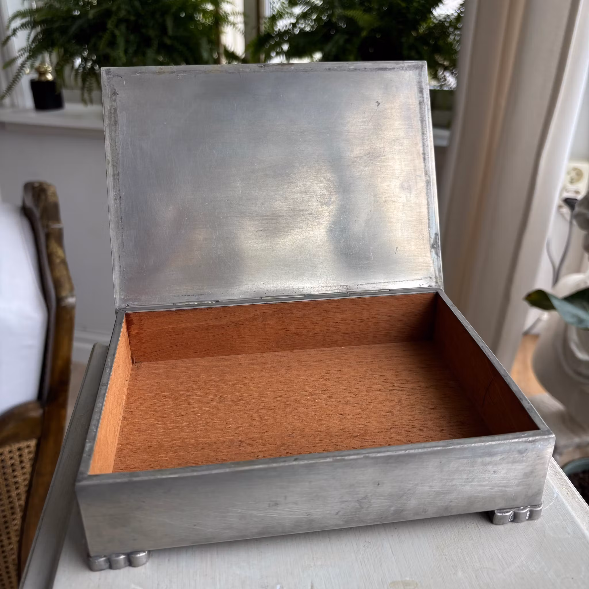 Detta fina etui skvallrar om tidigare historia. Jag kan bara ana hur det har skickats runt på en av de finare cigarrsalongerna. Idag tänker jag mig att man vill ha det till utsmycknad eller kanske för att lägga sina smycken däri. Etuiet är i tenn på fyra fina fötter och insida klädd i trä.