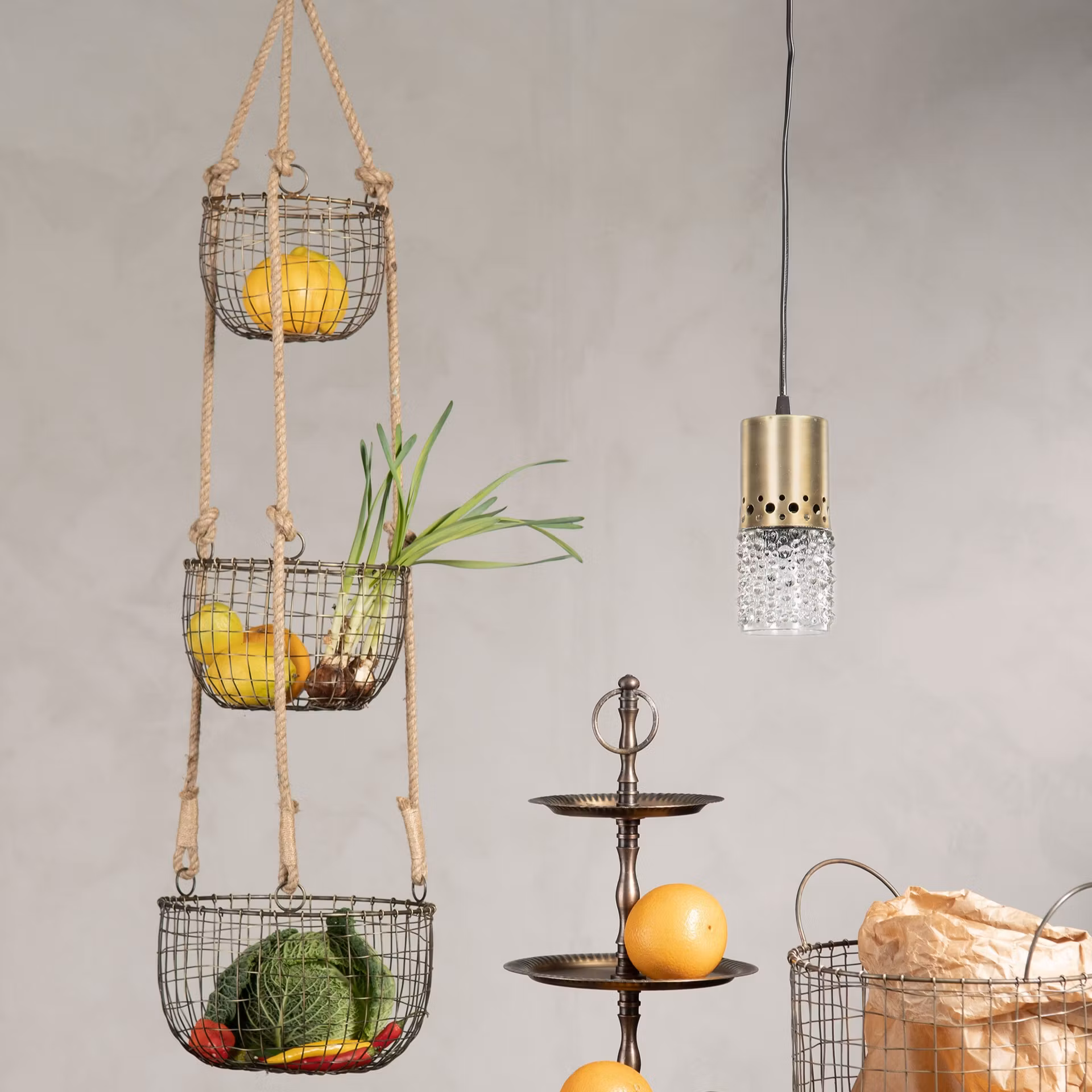 Tre hängande nätkorgar som binds samman och hängs upp med ett juterep. En praktisk och snygg förvaringslösning i hemmet. Tillverkad i metall och jute.