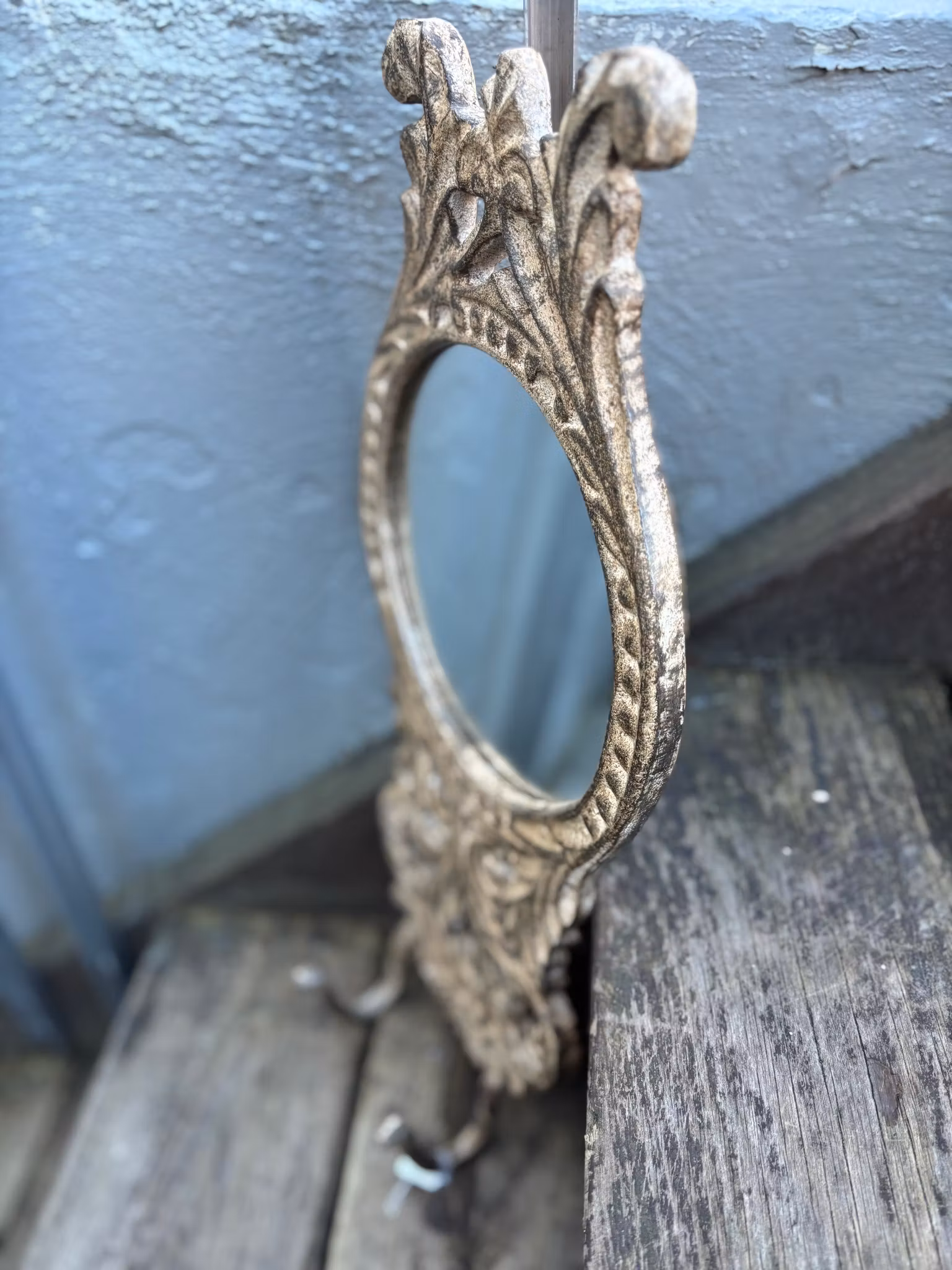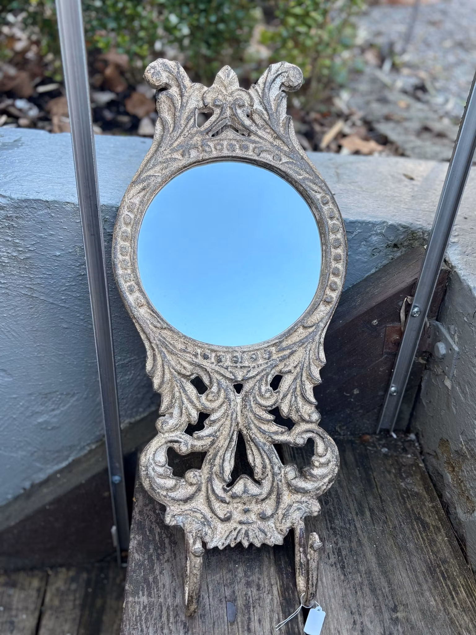 En riktigt charmig spegel av gjutjärn. Vackert formad och mönstrad med två krokar längst ner. Färgerna går åt brunt och beiget. Själva spegelglaset är runt. En mindre spegel perfekt som ansiktsspegel eller dekoration. De två krokarna gör ju att den verkligen kan komma till användning, kanske i sovrummet eller hallen.