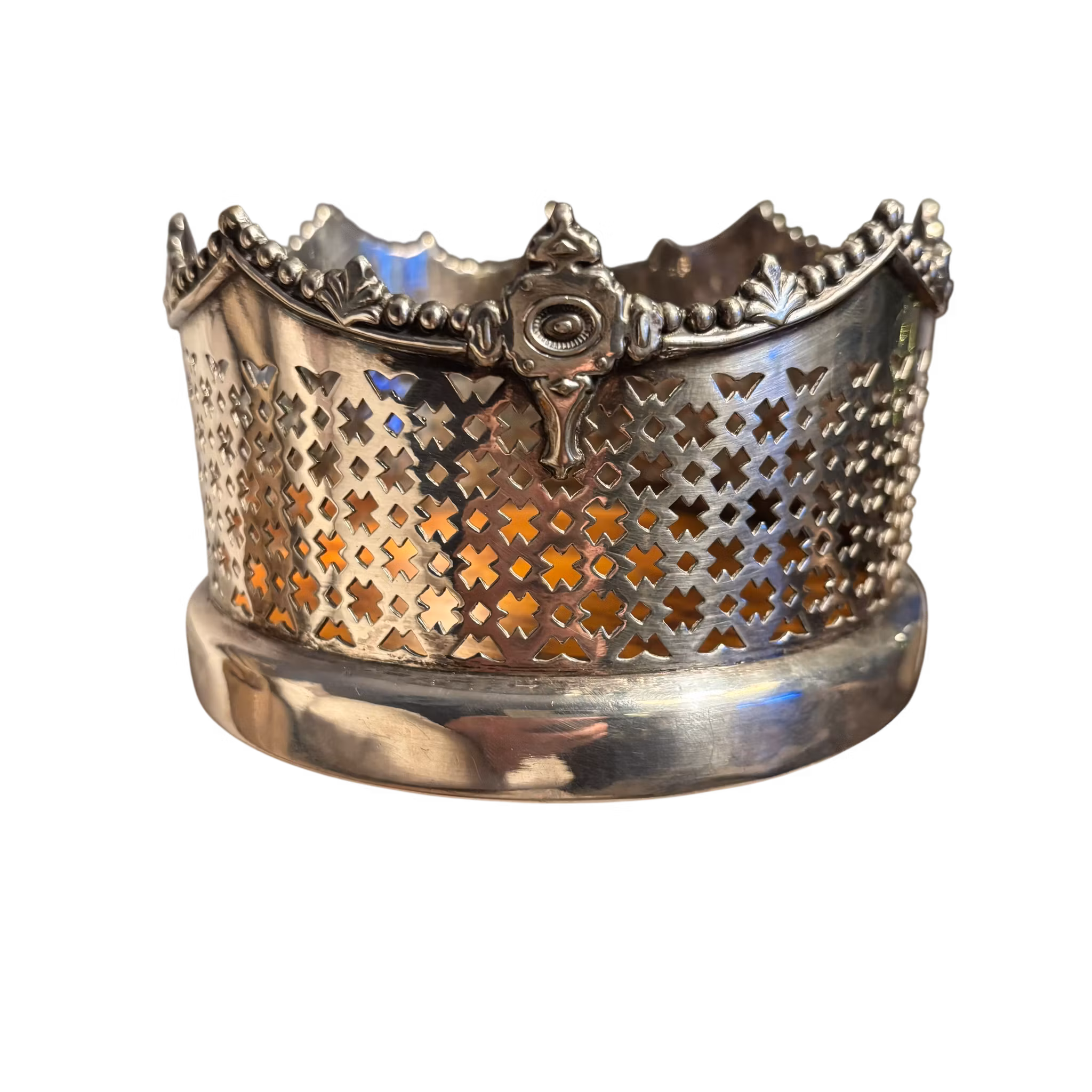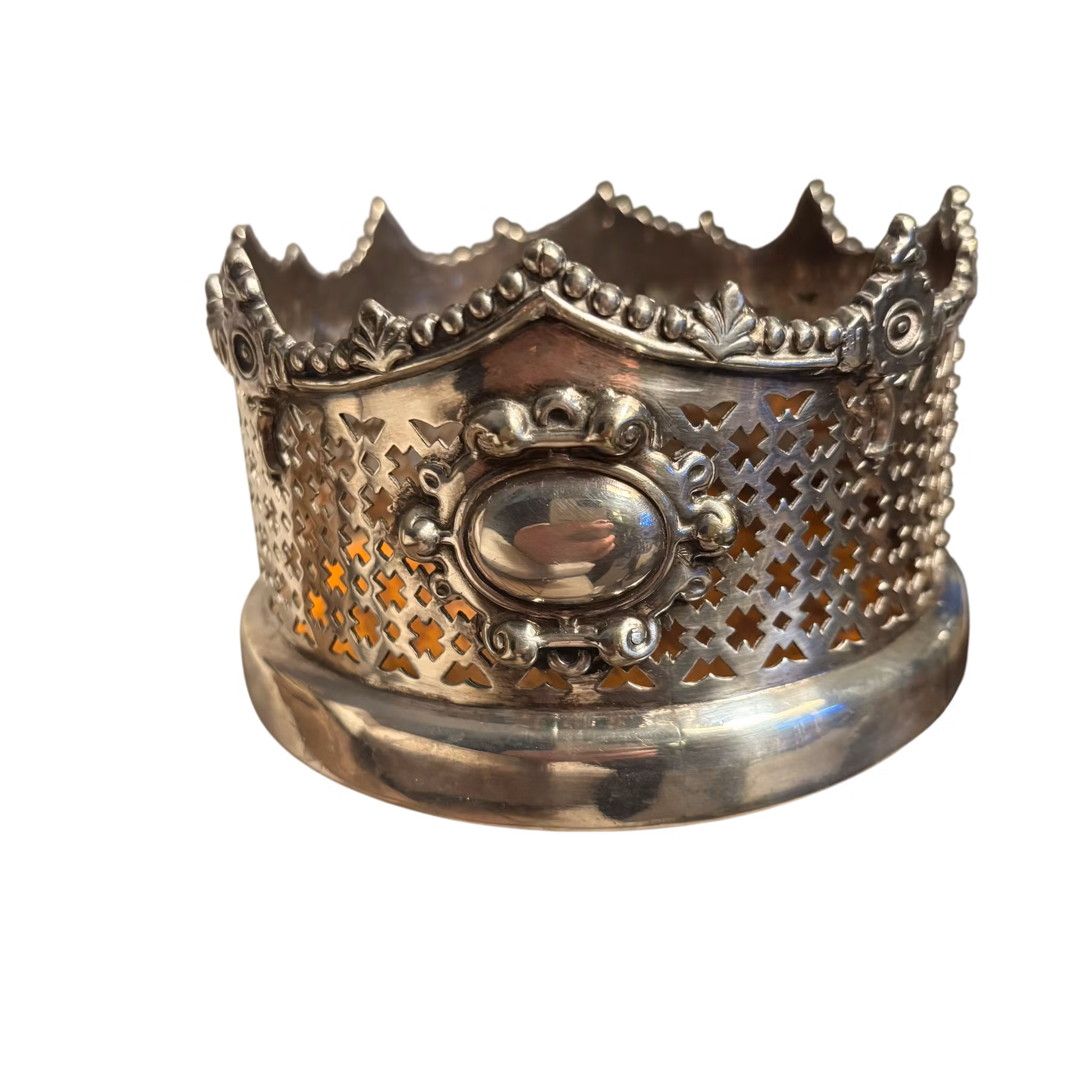 Fantastiska coasters inropade på auktion. Två stycken likadana i lika fint vintageskick. Runda med träbotten med filtad undersida i bra skick. Sarg i metall med silverplättering ( enligt auktionsbolaget, har inte hittat några stämplar) men för mig är det smycket i sig som kommer förgylla din dukning. Vackert hålmönster med höjd. Passar fint både till den moderna och den äldre dukningsstilen.