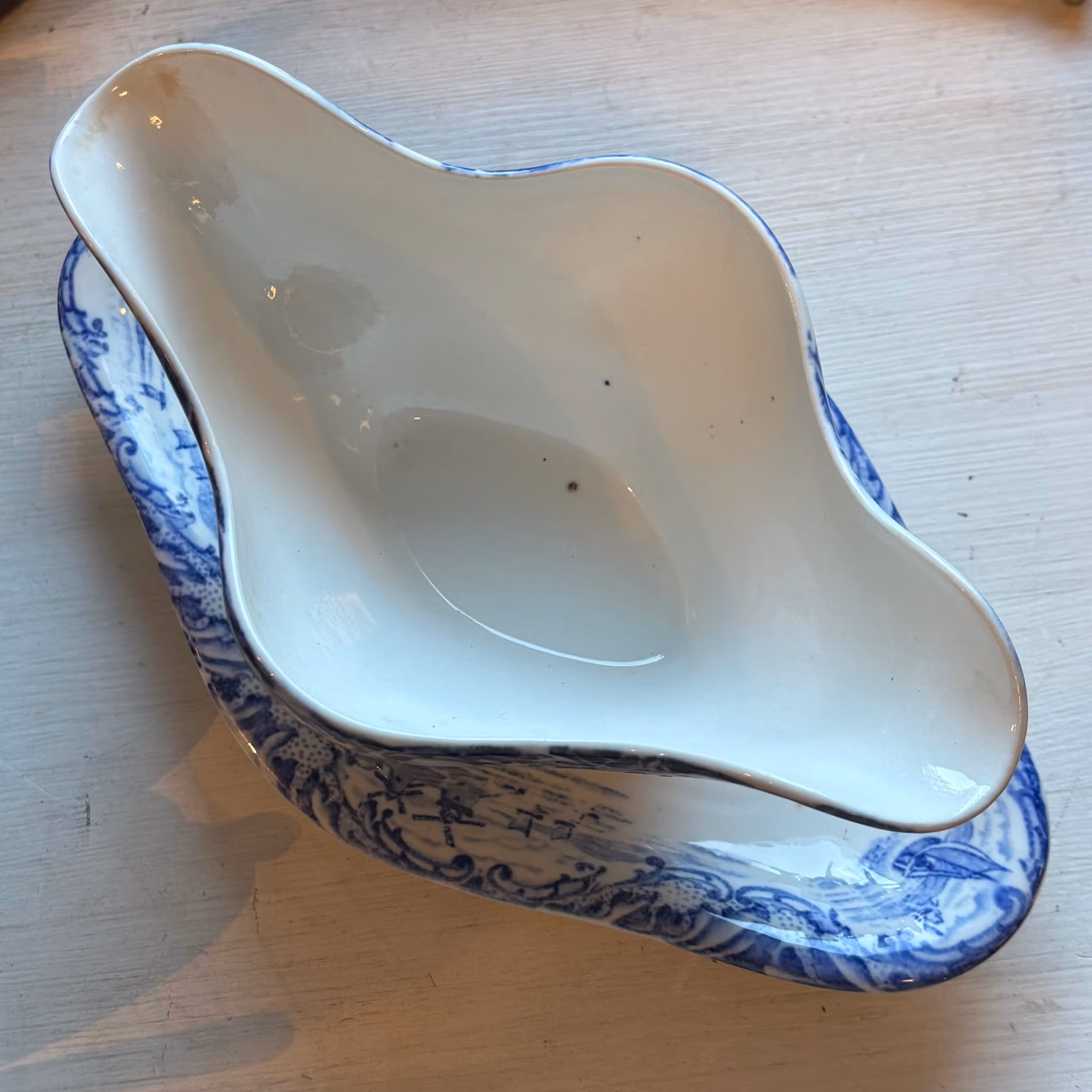 En såssnipa i benporslin från engelska märket Wedgwood och serien Mague. Den är i jättefint skick utan nagg eller skador. En liten lerplupp som syn i botten av snipan men det är från tillverkningens tid och ingen skada. En oval form med snipa på fat i vitt och blått med ett mönster i form av ett landskap. En detalj som lyfter alla middagsbord om du så fyller den med sås eller blommor.
