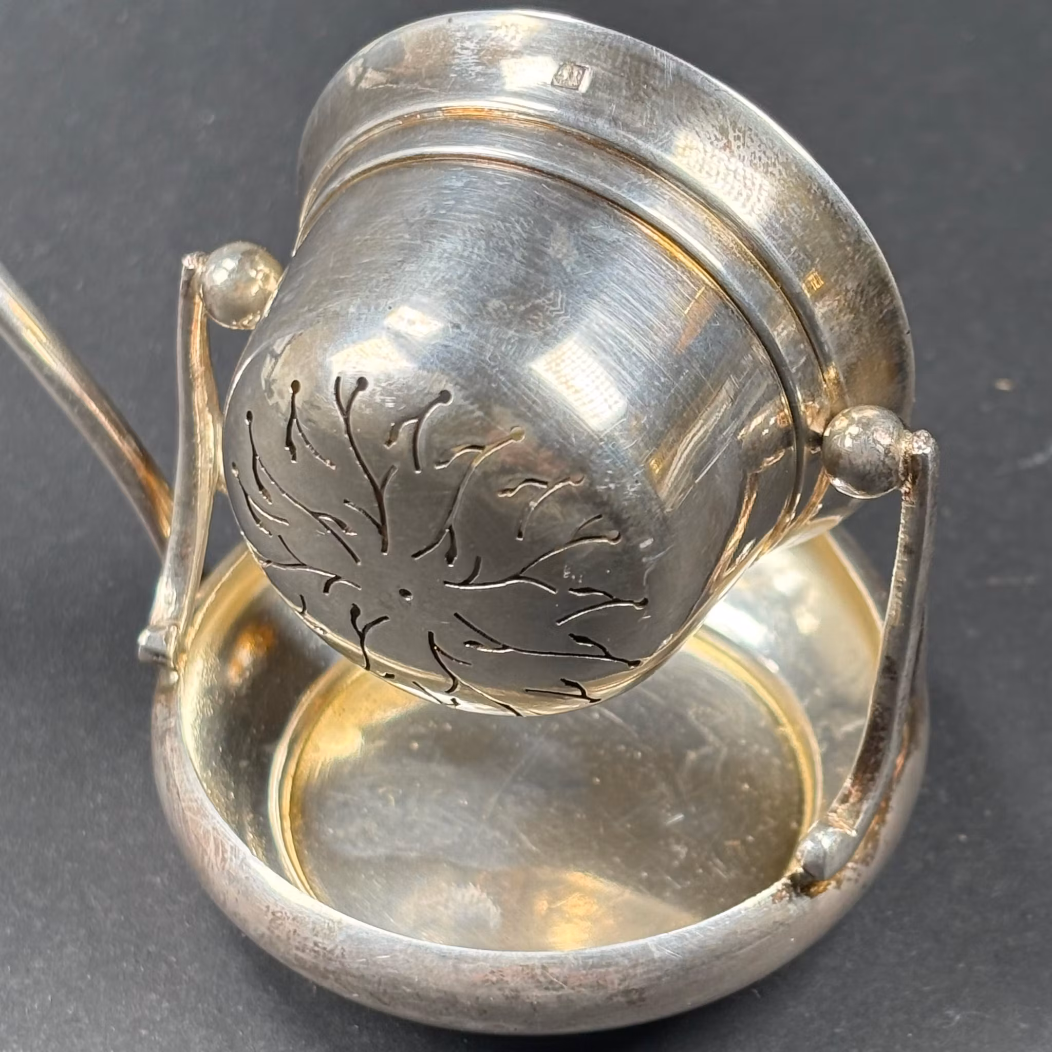 En väldigt smart och vackert dekorerad tesil på ställning med handtag. När du vickar på den kan du doppa den i koppen och sen vrida upp den och ställa den på bo