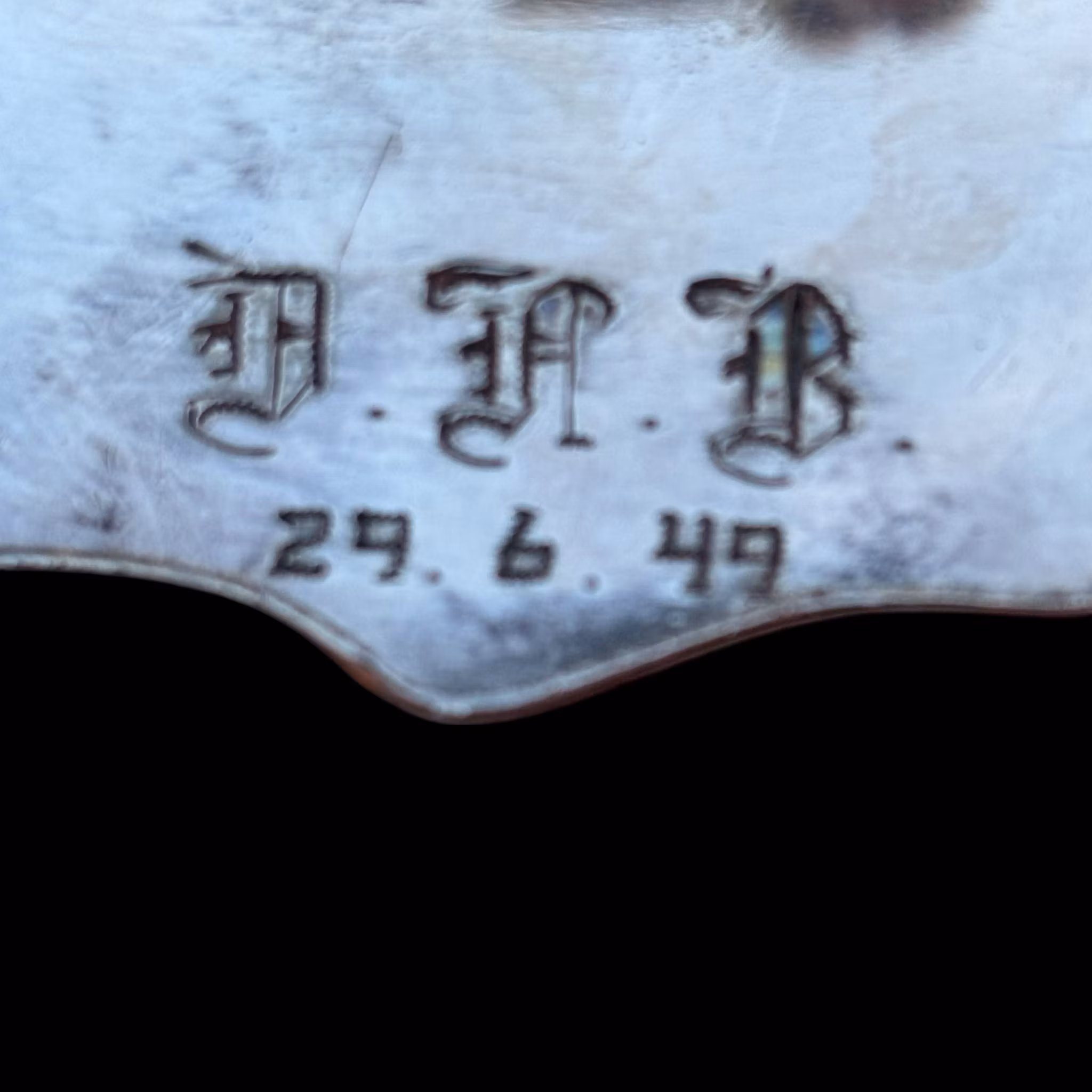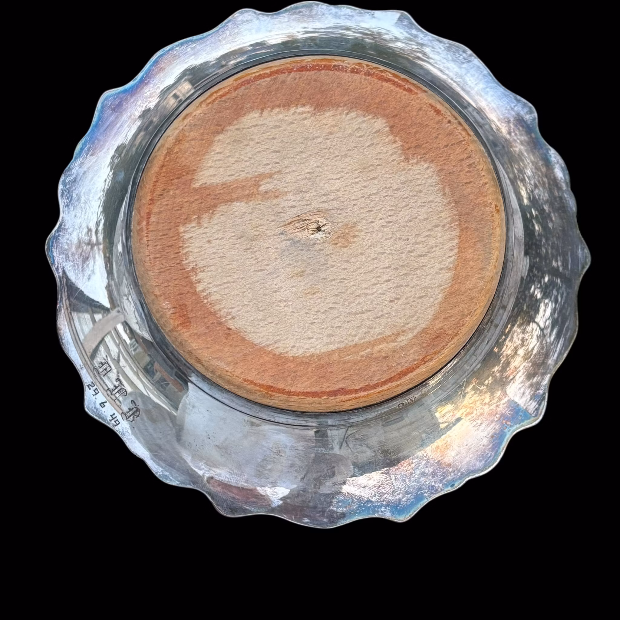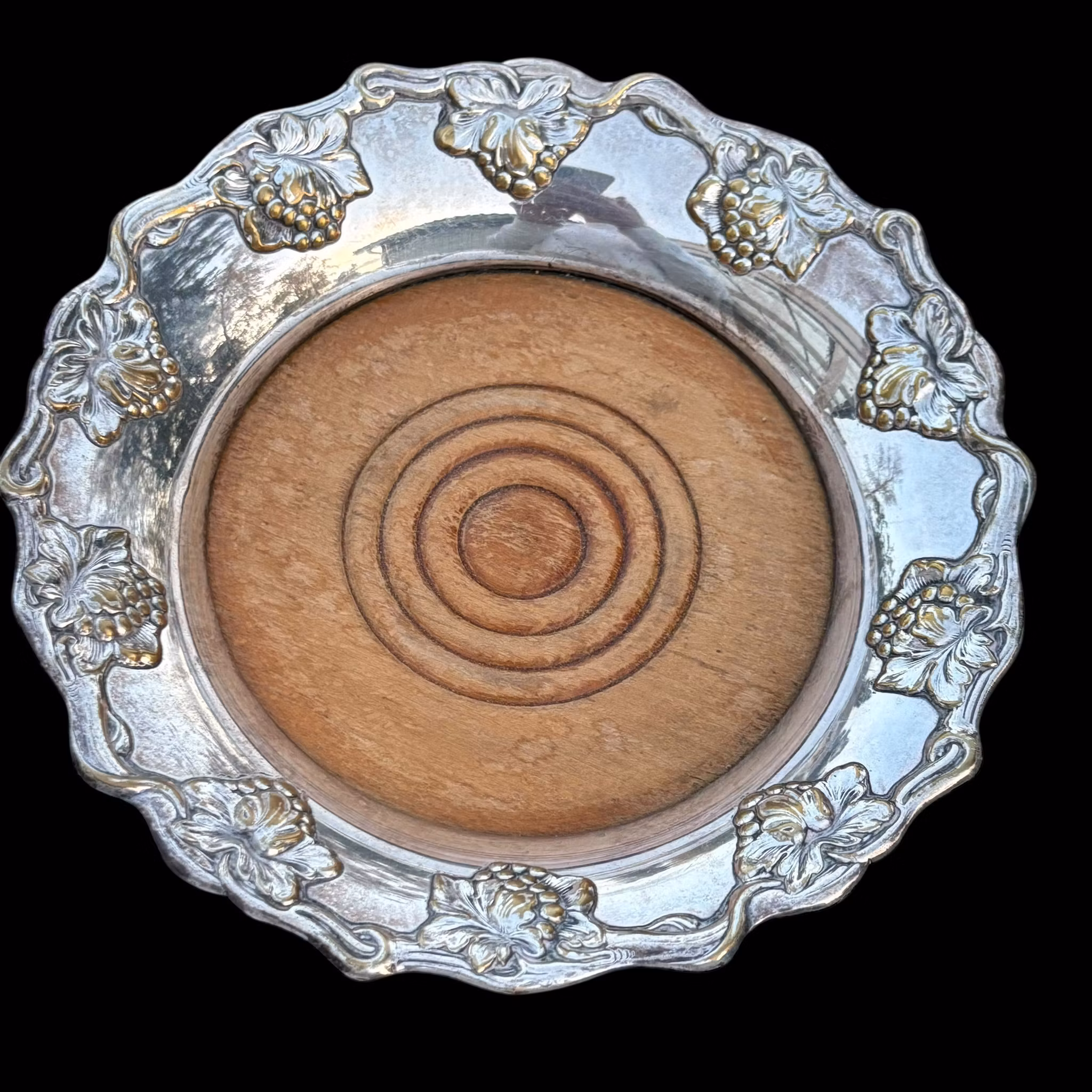 Ett äldre klassiskt underlägg för vinflaska eller karaff. Underlägget är från England med botten i trä, undersida saknar sin gröna filt utan har en trären yta.. Sargen är i dekorerad nysilver med bladmönster. Detta exemplar har ingraverat på undersidan initialer från 1949. Jag ser framför mig hur det här har hängt med på de finare borden i de gamla engelska salongerna. Karaffer i kristallglas fyllda med vin eller whisky, alternativt vinflaskor, de skyddade bord och bordsdukar med underlägg.