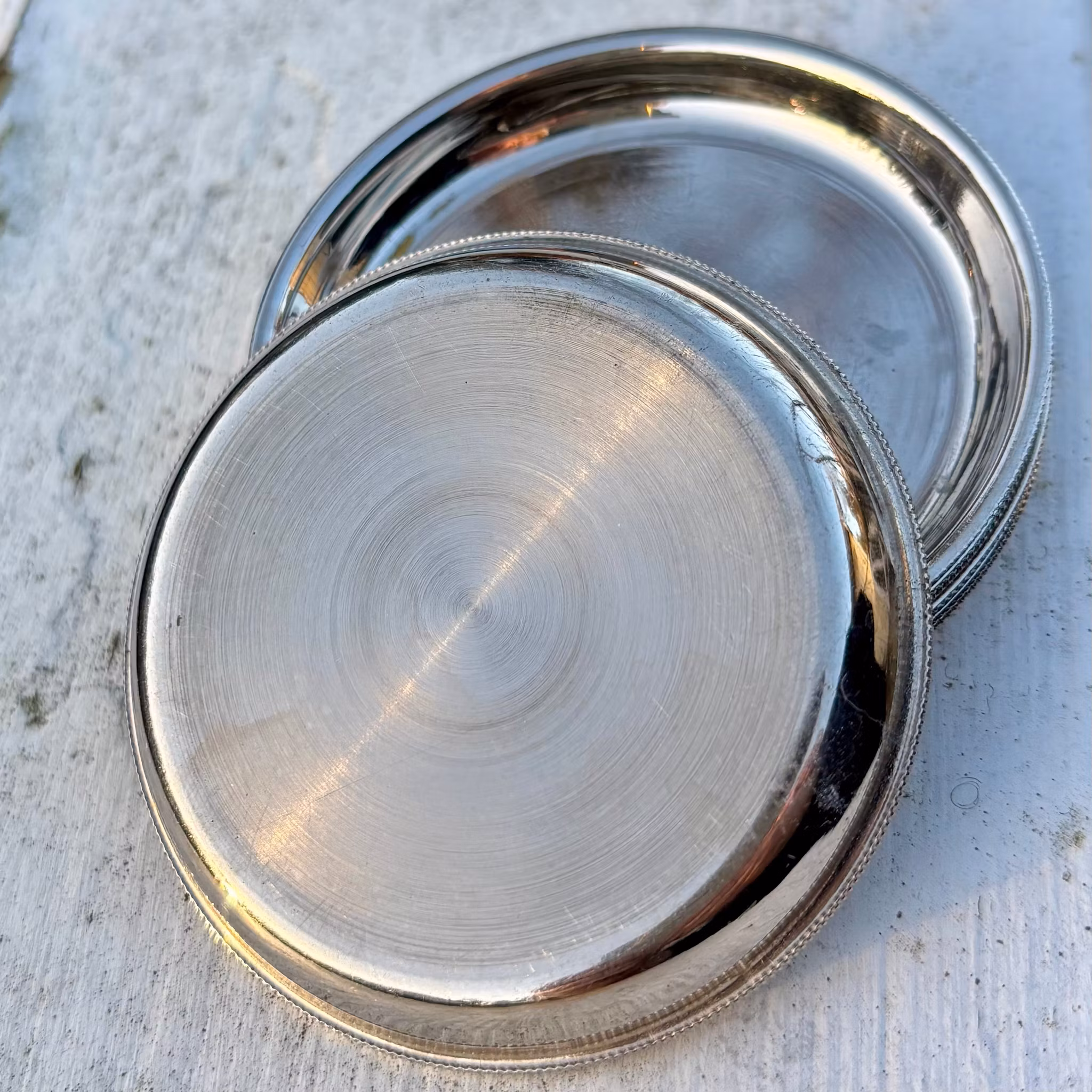 Fina små underlägg i metall för de mindre glasen, glöggmuggarna eller krukorna. I priset ingår 8st. Alla med en fin liten pärlad kant. Fint vintageskick.