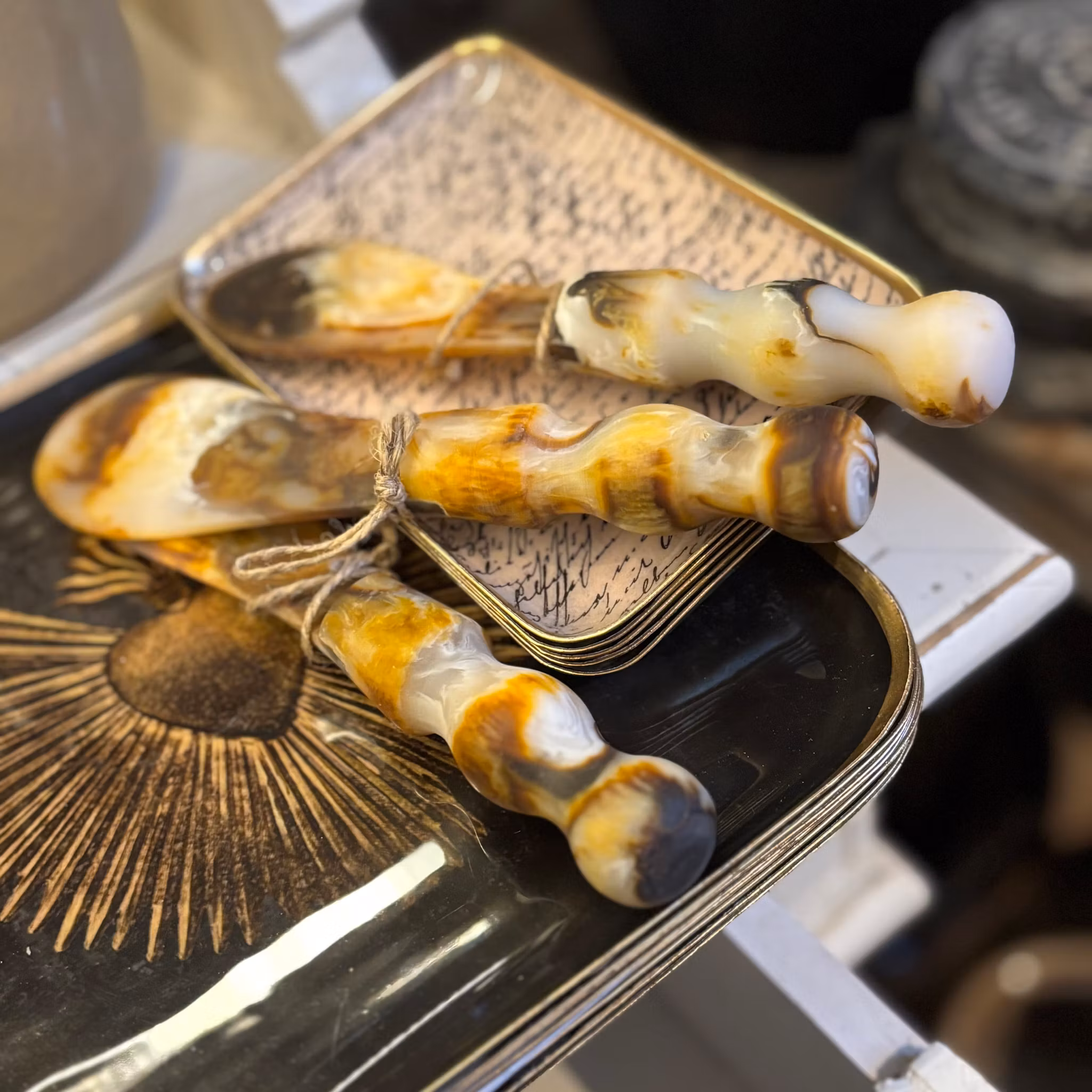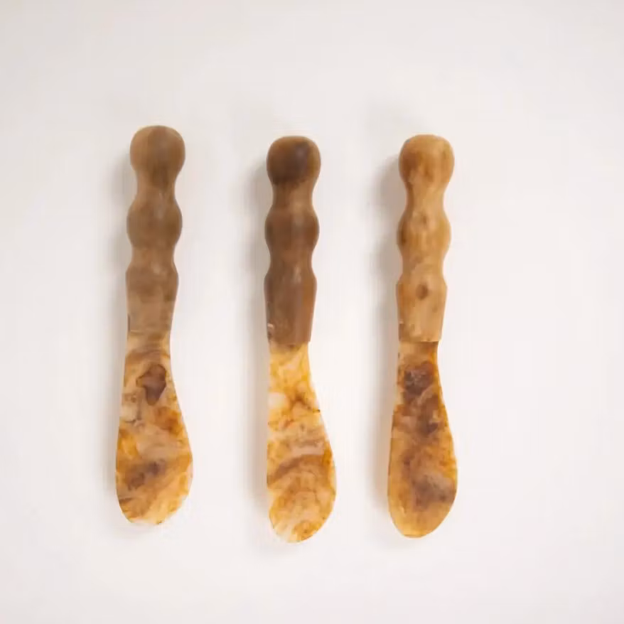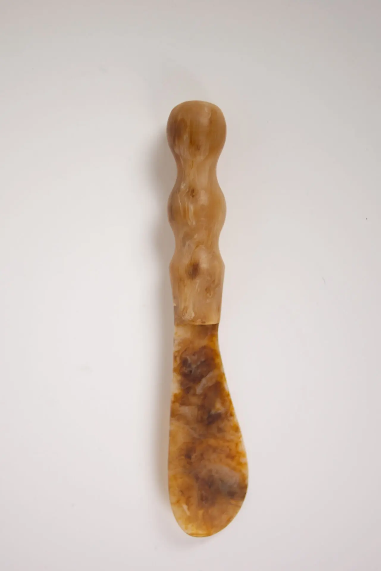 Underbart charmiga smörknivar i materialet resin som är en sorts hårdplast. Resinets natur gör varje produkt unik. Så sköna att hålla i och fina att duka med.