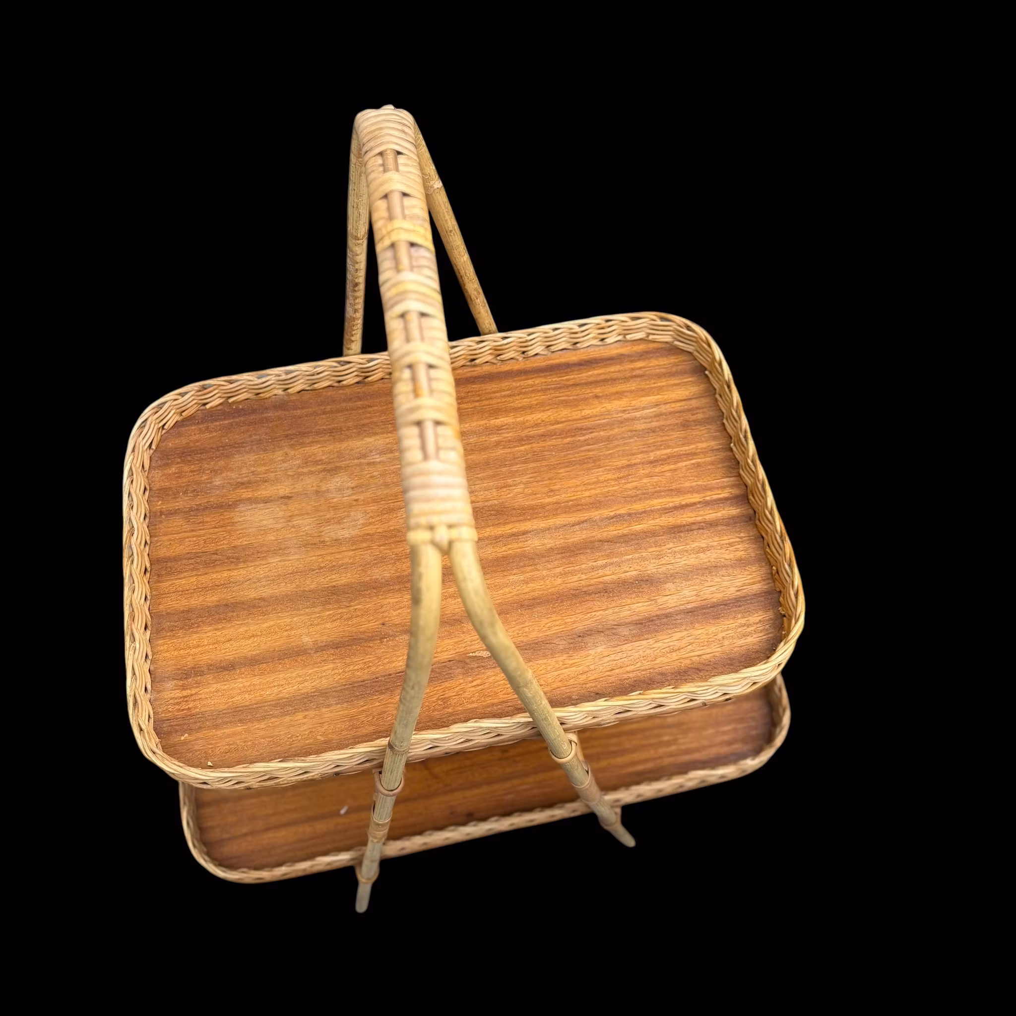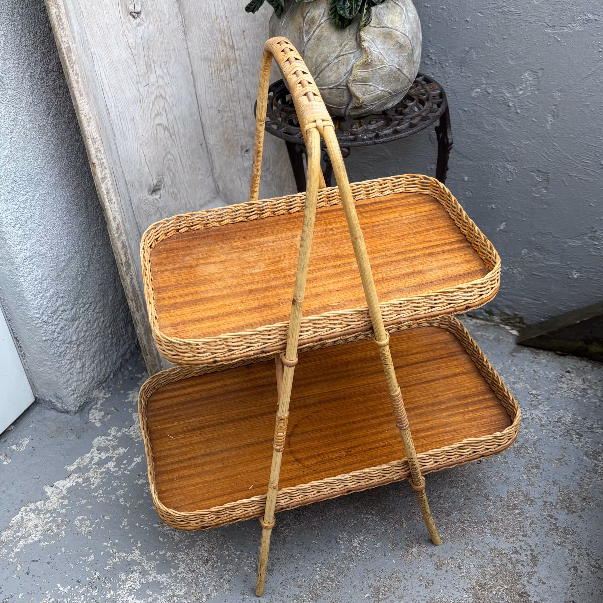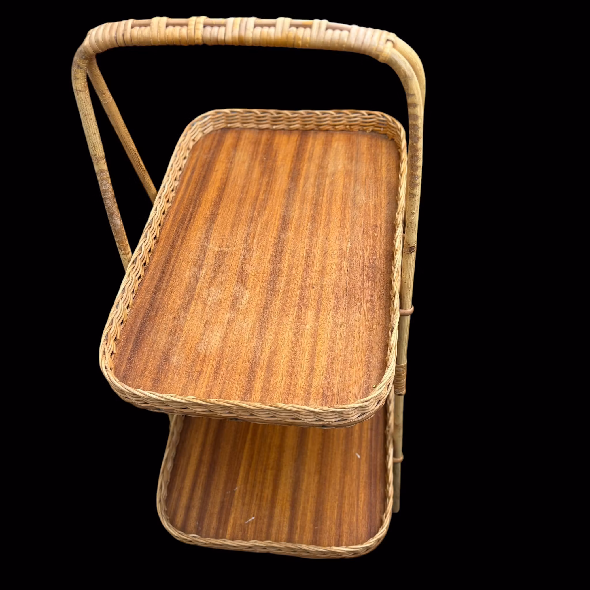 Brickbord eller en serveringskorg i två plan, typiskt tillverkad under 1950/1960-talet. Denna specifika modell kombinerar en stomme av bambu och rotting med brickbottnar i teakfanér.