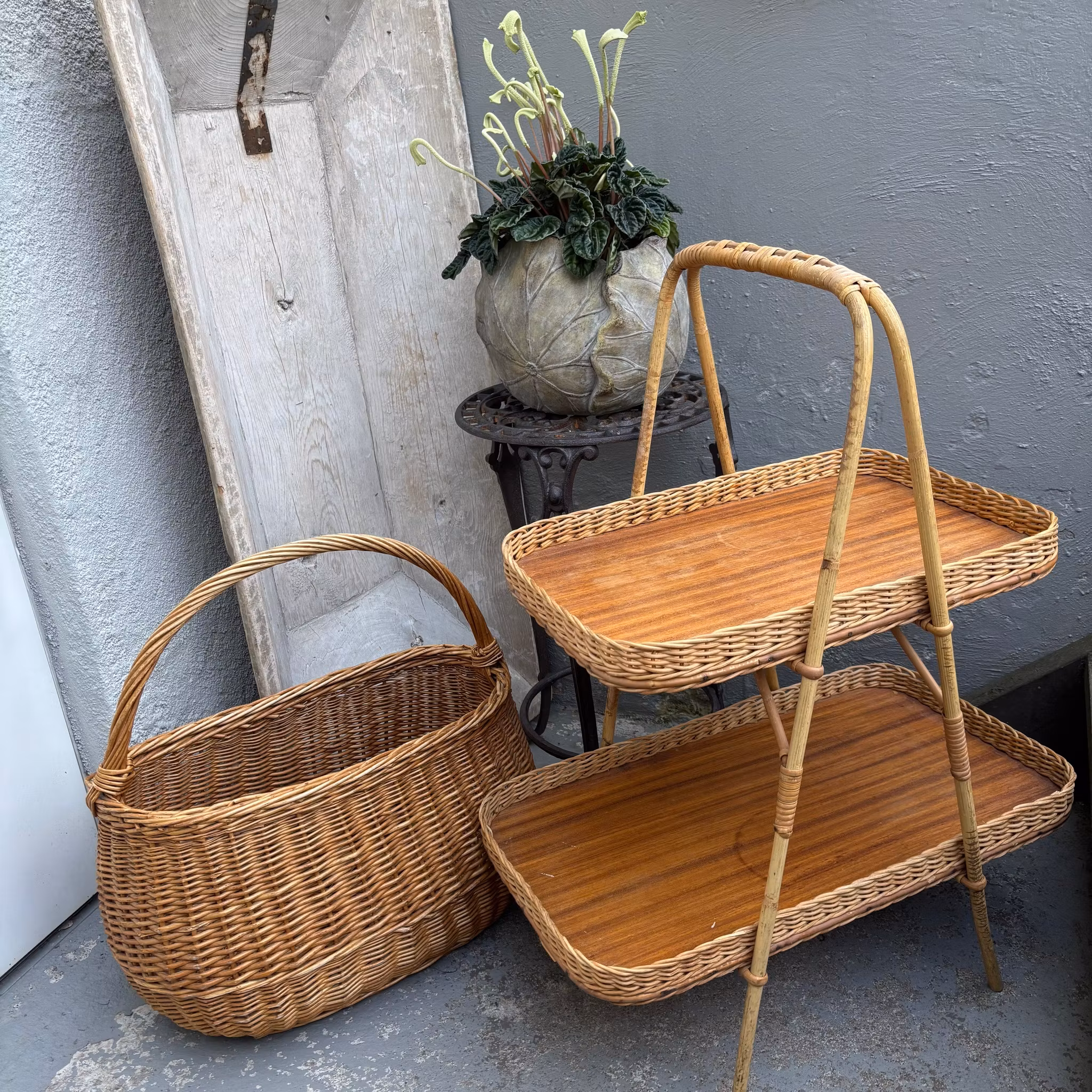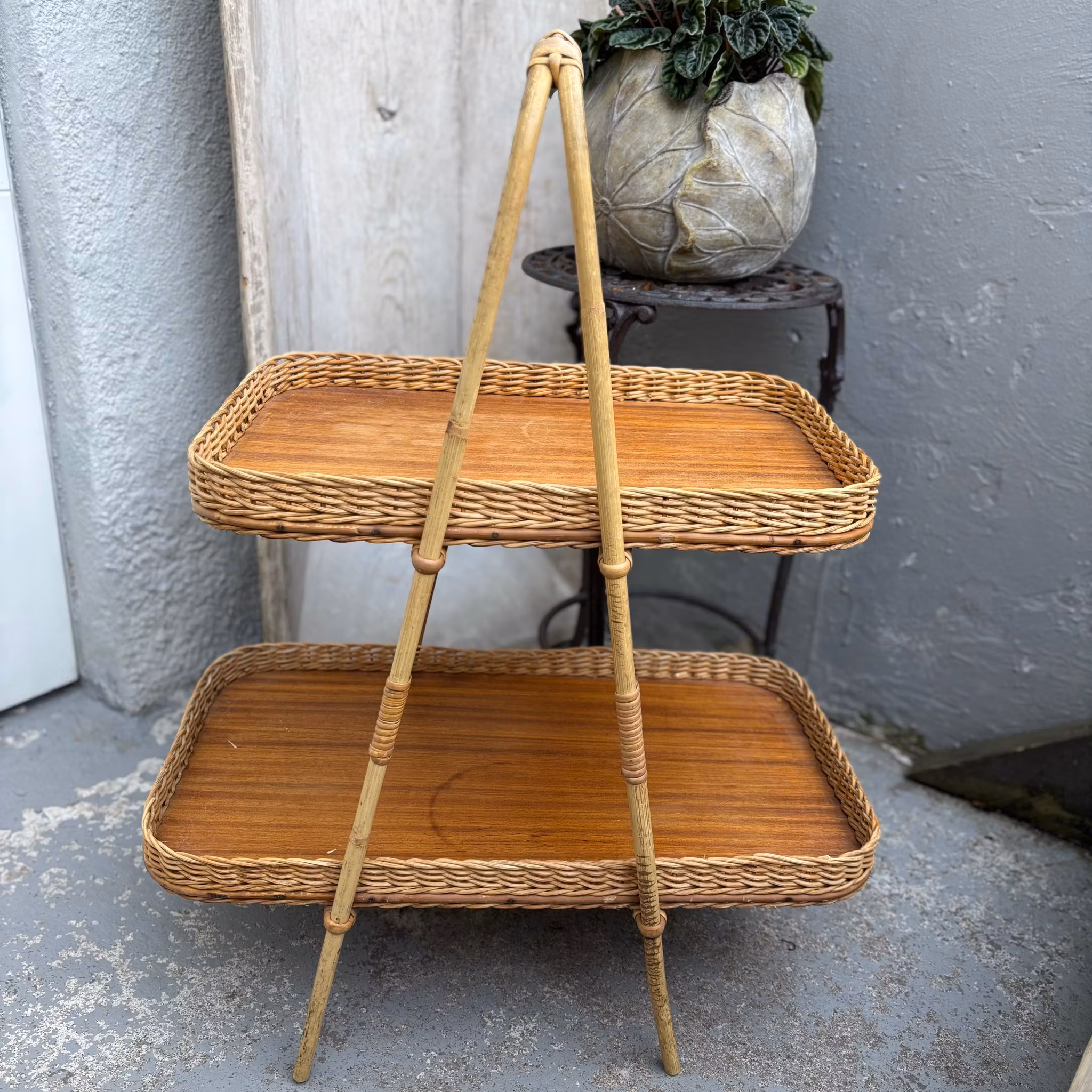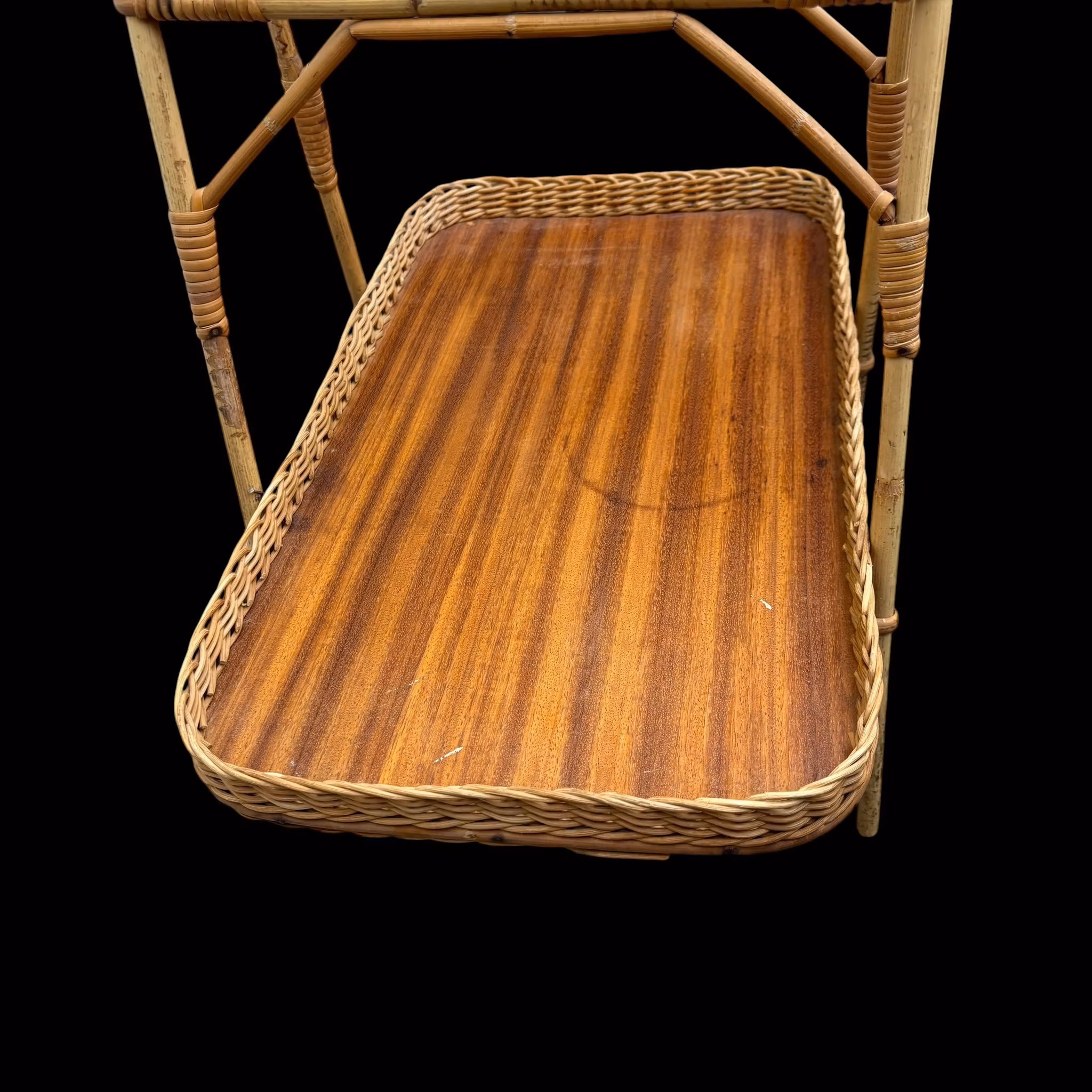 Brickbord eller en serveringskorg i två plan, typiskt tillverkad under 1950/1960-talet. Denna specifika modell kombinerar en stomme av bambu och rotting med brickbottnar i teakfanér.