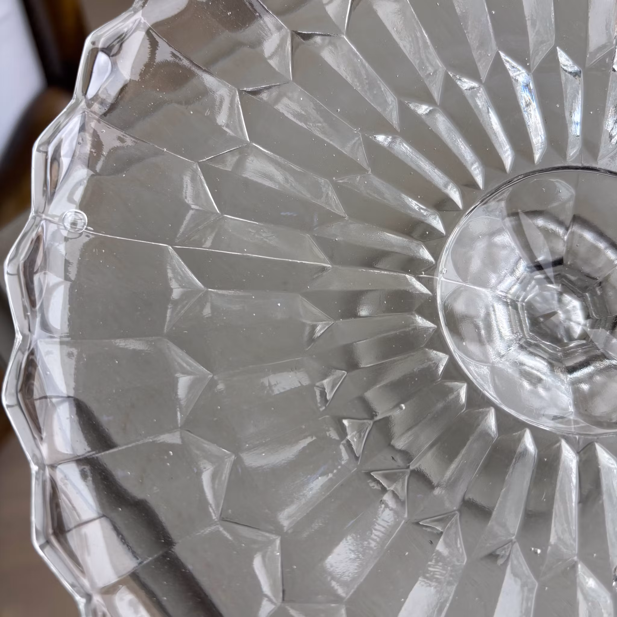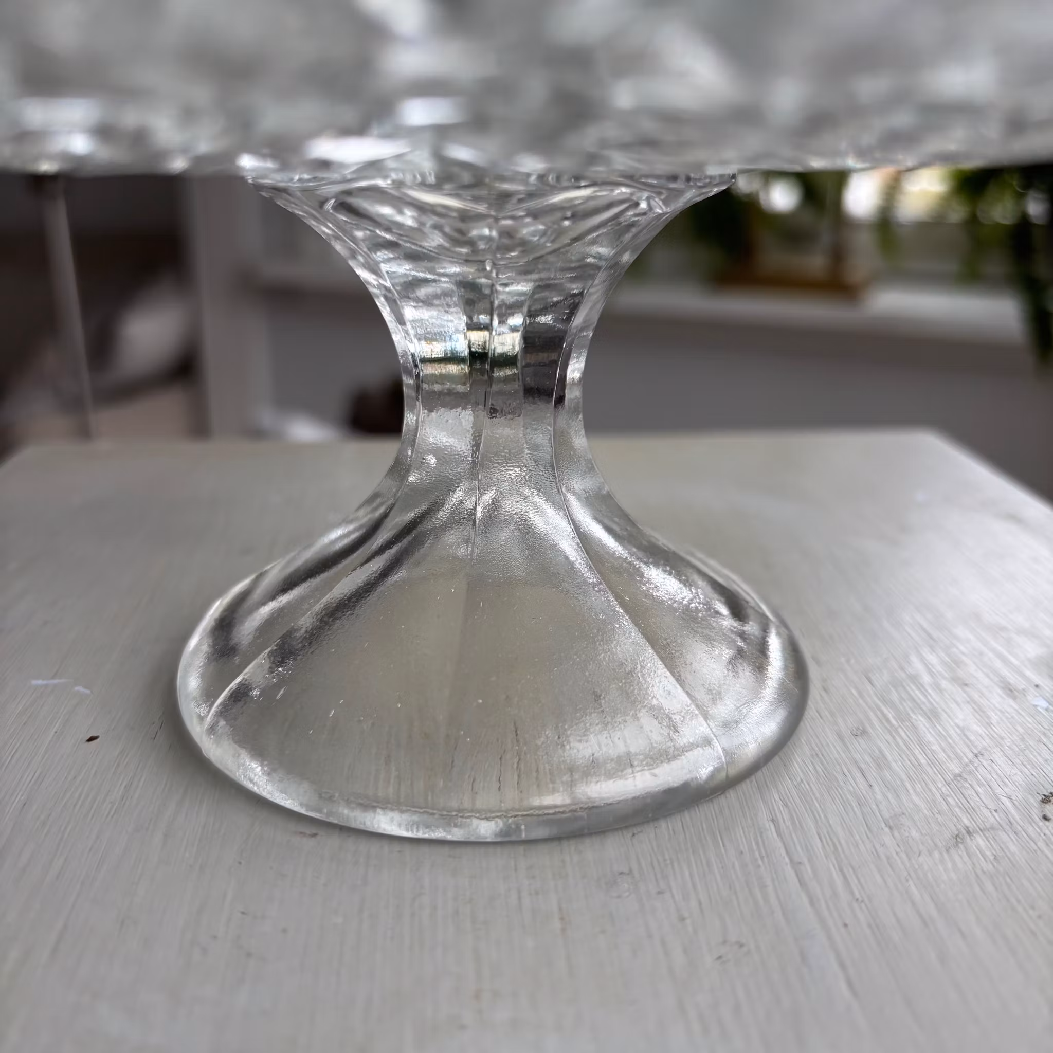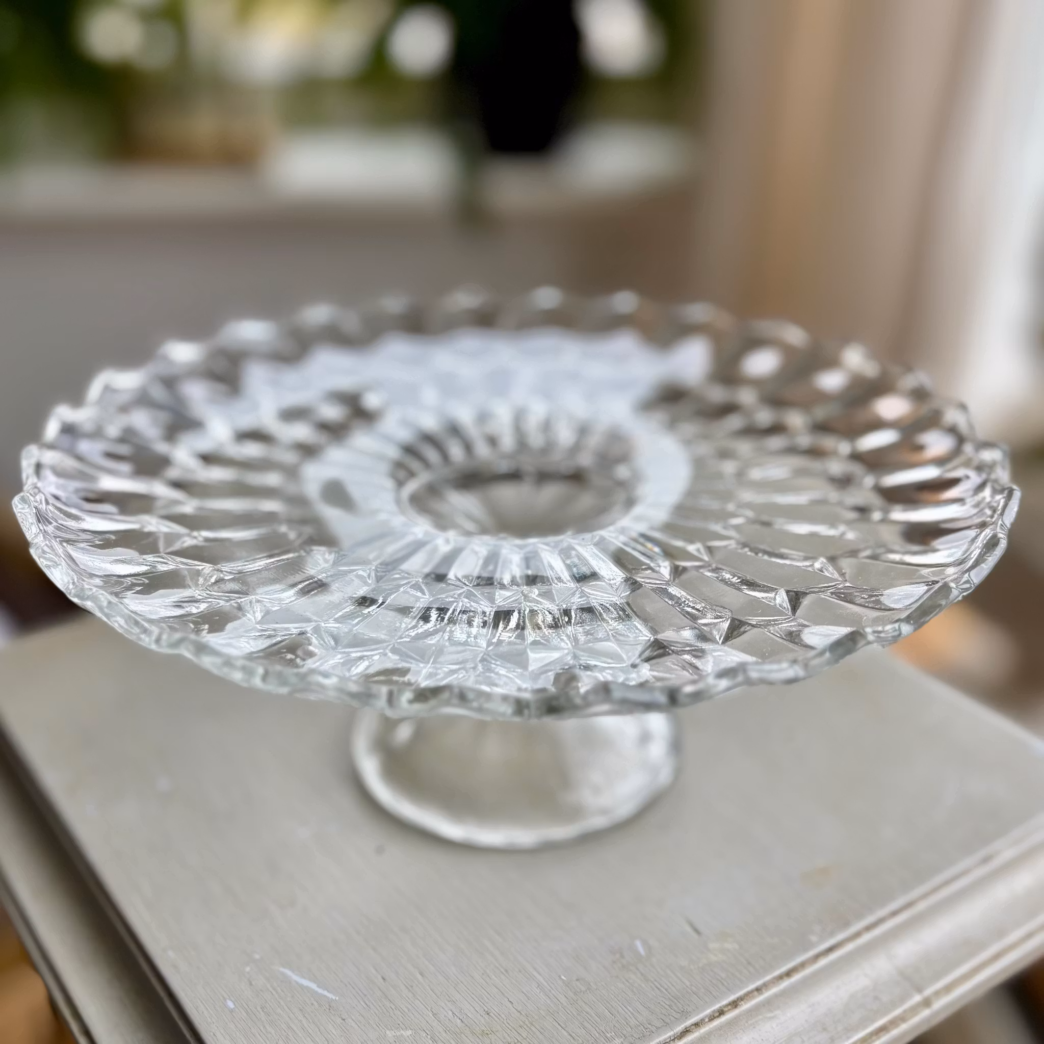Ett riktigt blickfång på kalaset skapar du med detta kakfat på fot. Ett runt fat i glas med enkelt men vackert mönster. Fatet är perfekt som komplement på buffen om du så behöver lägga fram kakor, smörgåsar, snittar eller mat. En liten upphöjd kant och en liten grop i mitten.