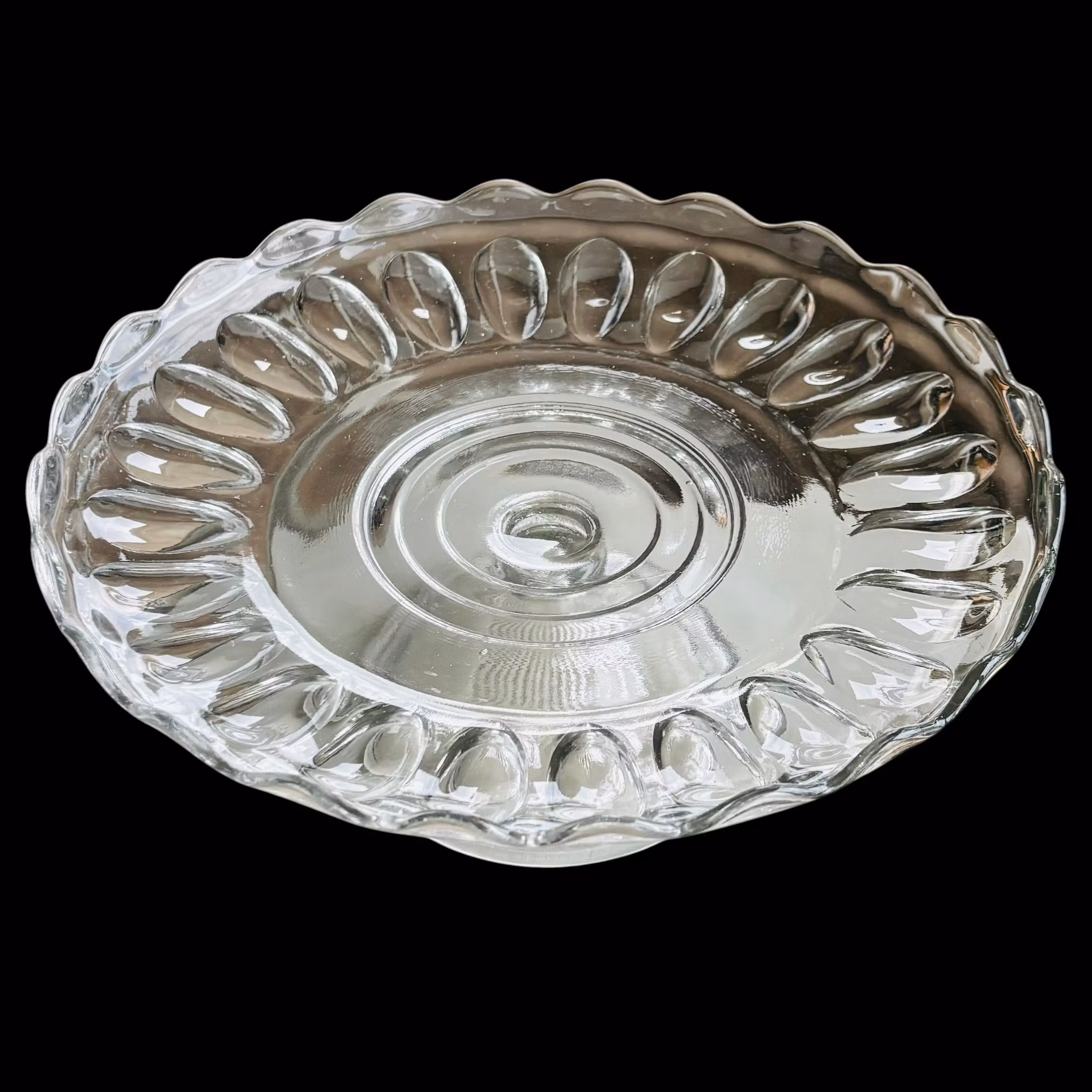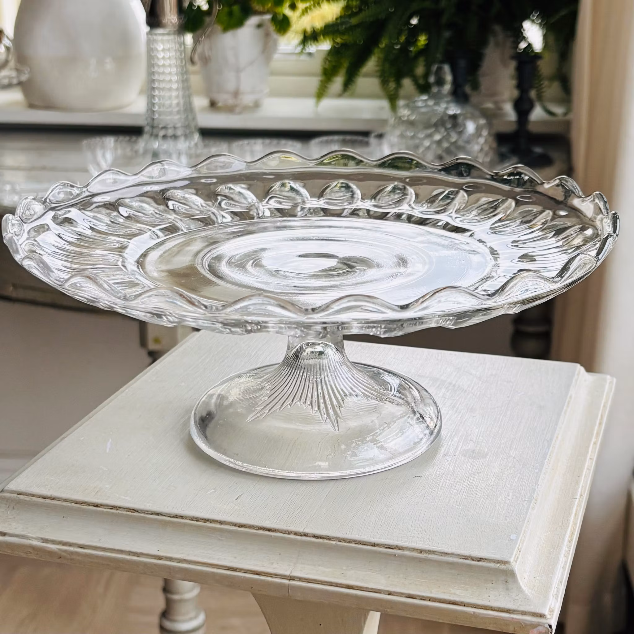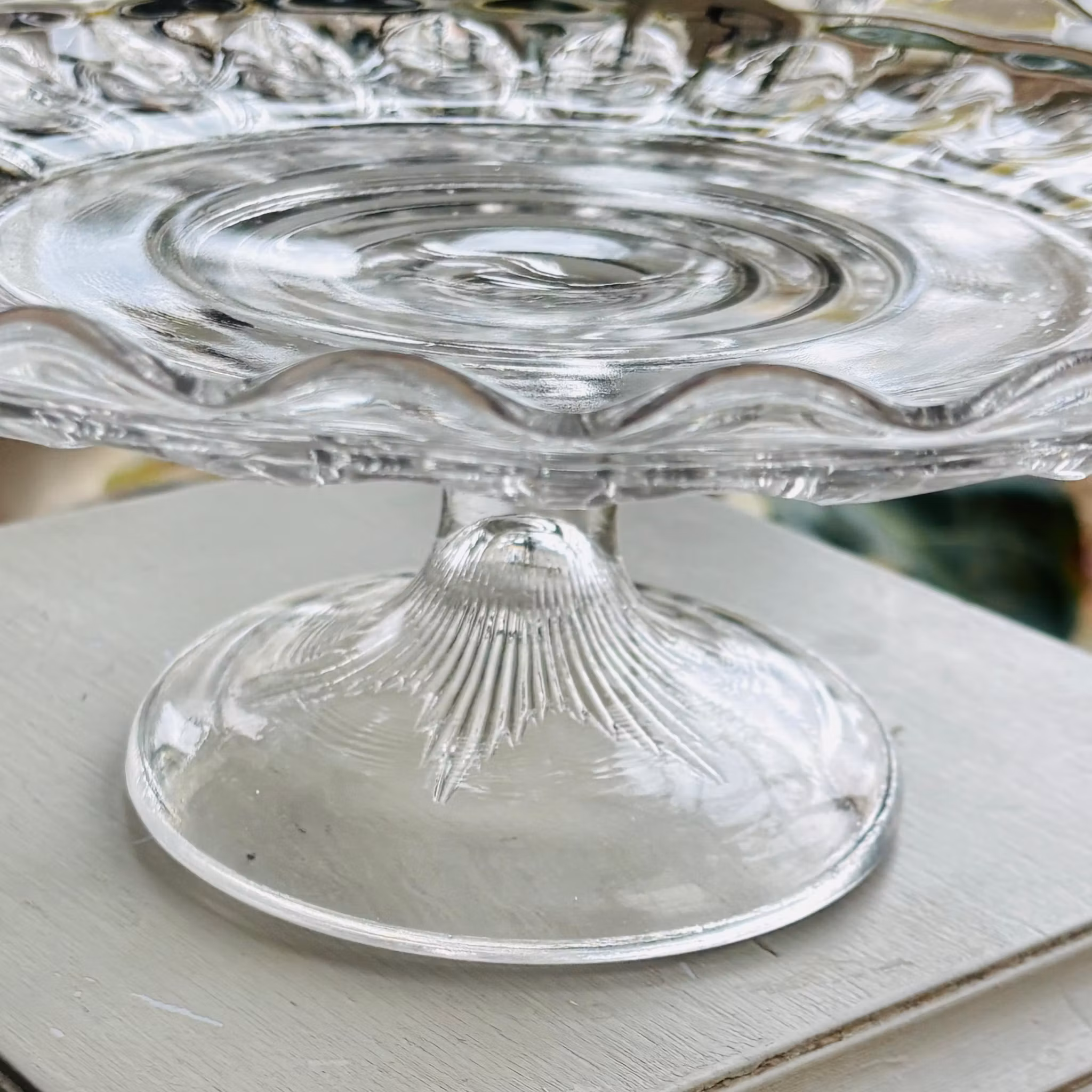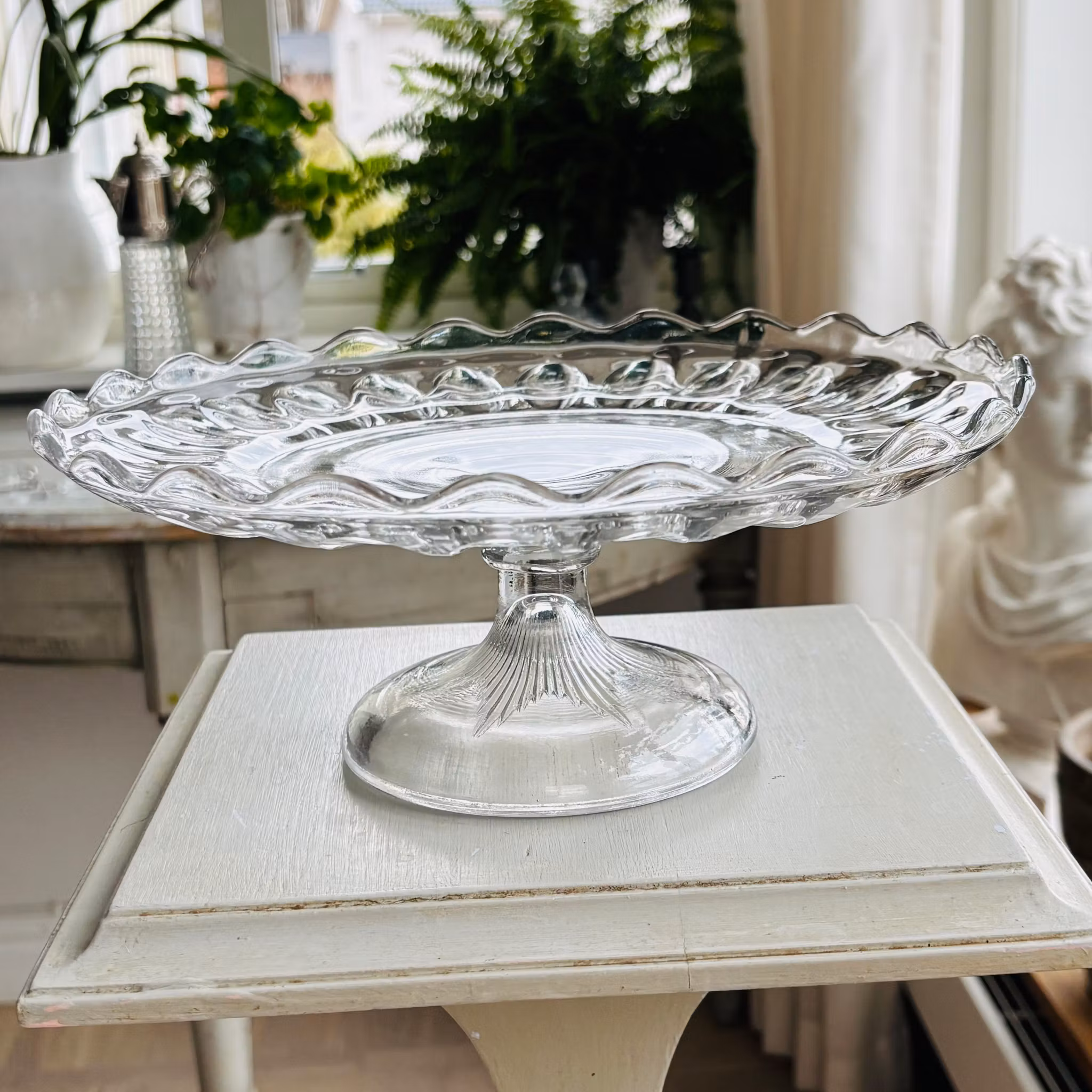 Ett vackert fat på fot i glas. Enkelt dekorerat med ränder på foten och ovala bubblor i fatet. Kanten är vågig och lite upphöjd. Det perfekta fatet med plats för tårta. Det där fatet du använder till alla kalas, smörgåstårta, gräddtårta, kakor eller snittar. Så användbart också att det är på fot som gör att du kan duka både tilltalande och mer platsekonomiskt. Fatet är väldigt vackert som det är och passar därför extra bra som dekoration även när det inte används. Fint använt bruksskick.