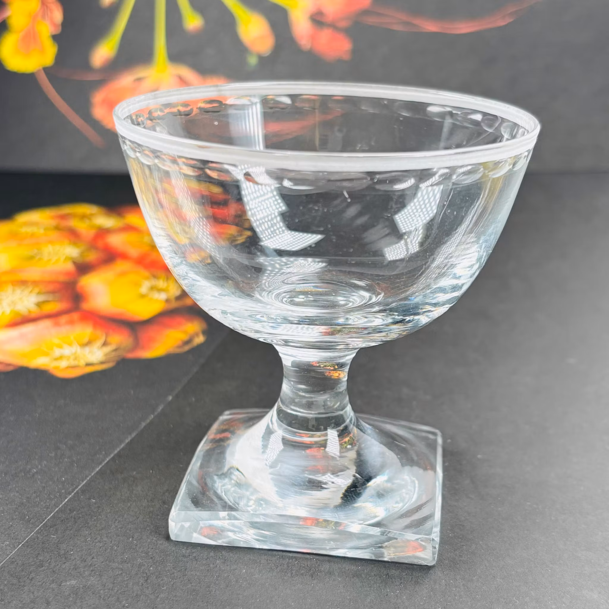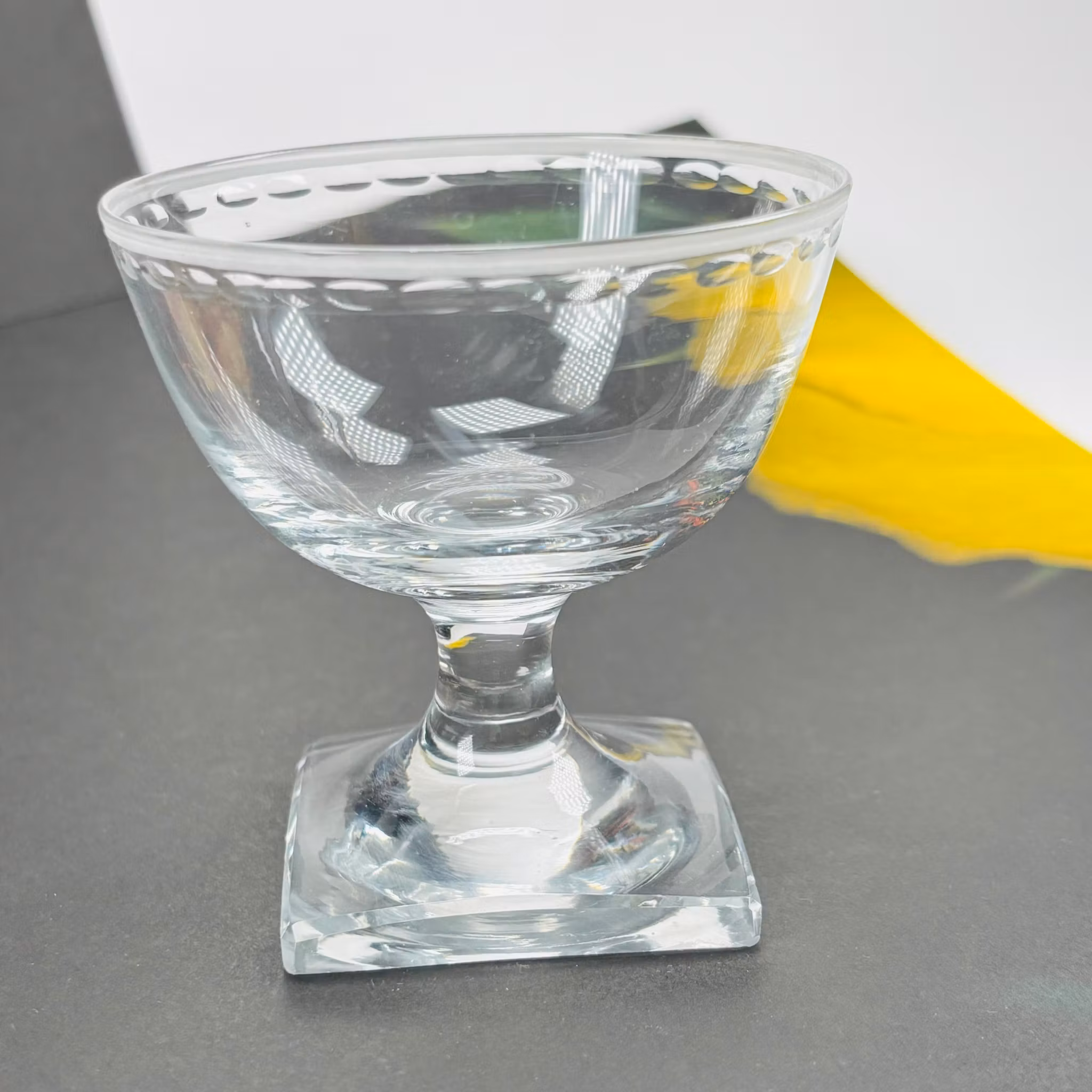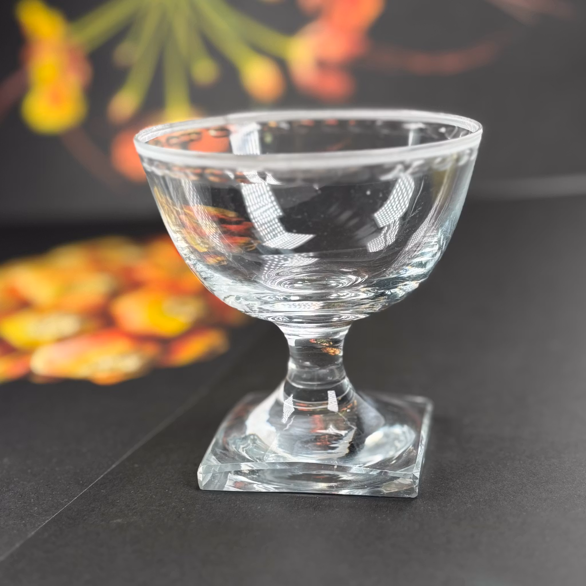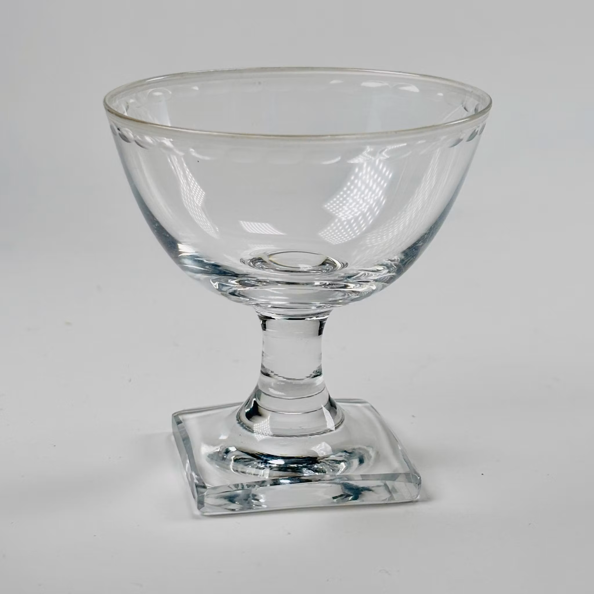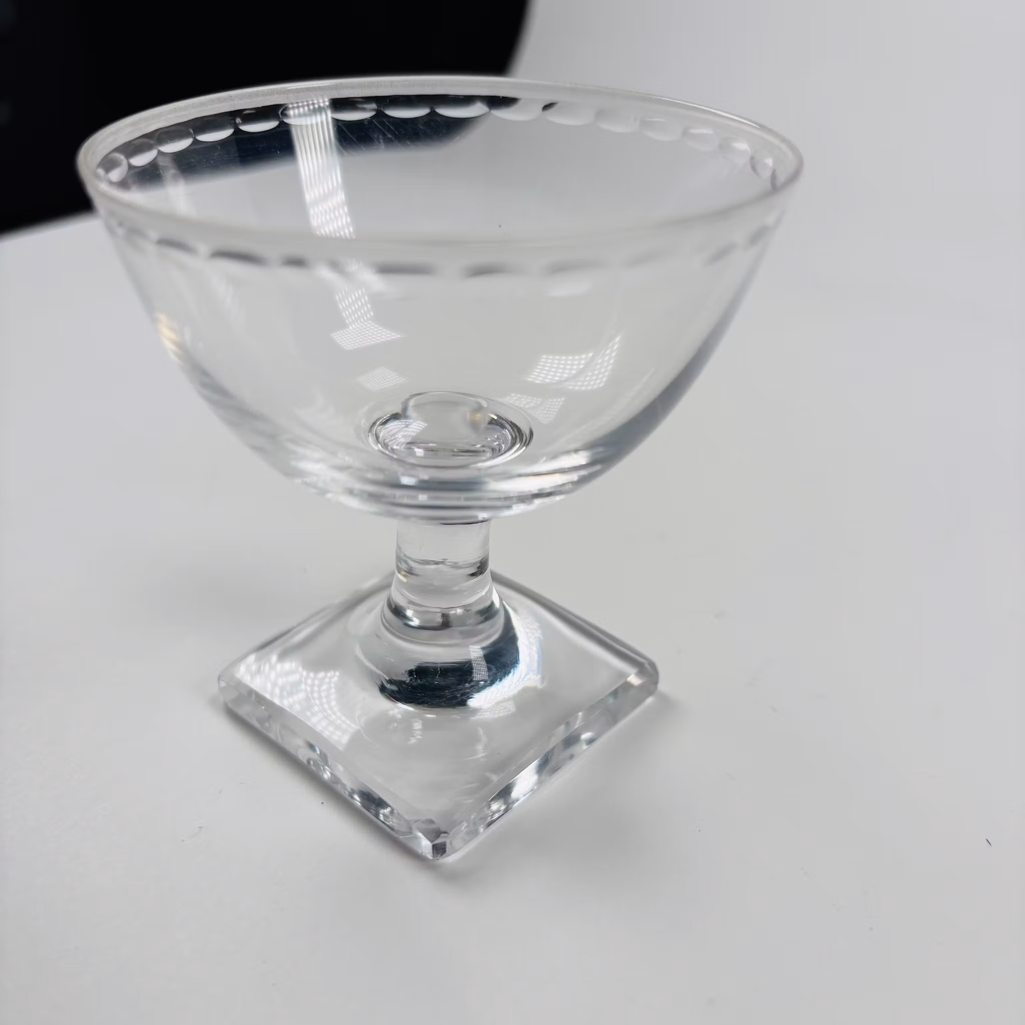 Några mindre glas i kristall. En fyrkantig fot och en etsad rand vid kanten. Klassiskt används de till likör eller dessertvin men varför inte duka upp till morg