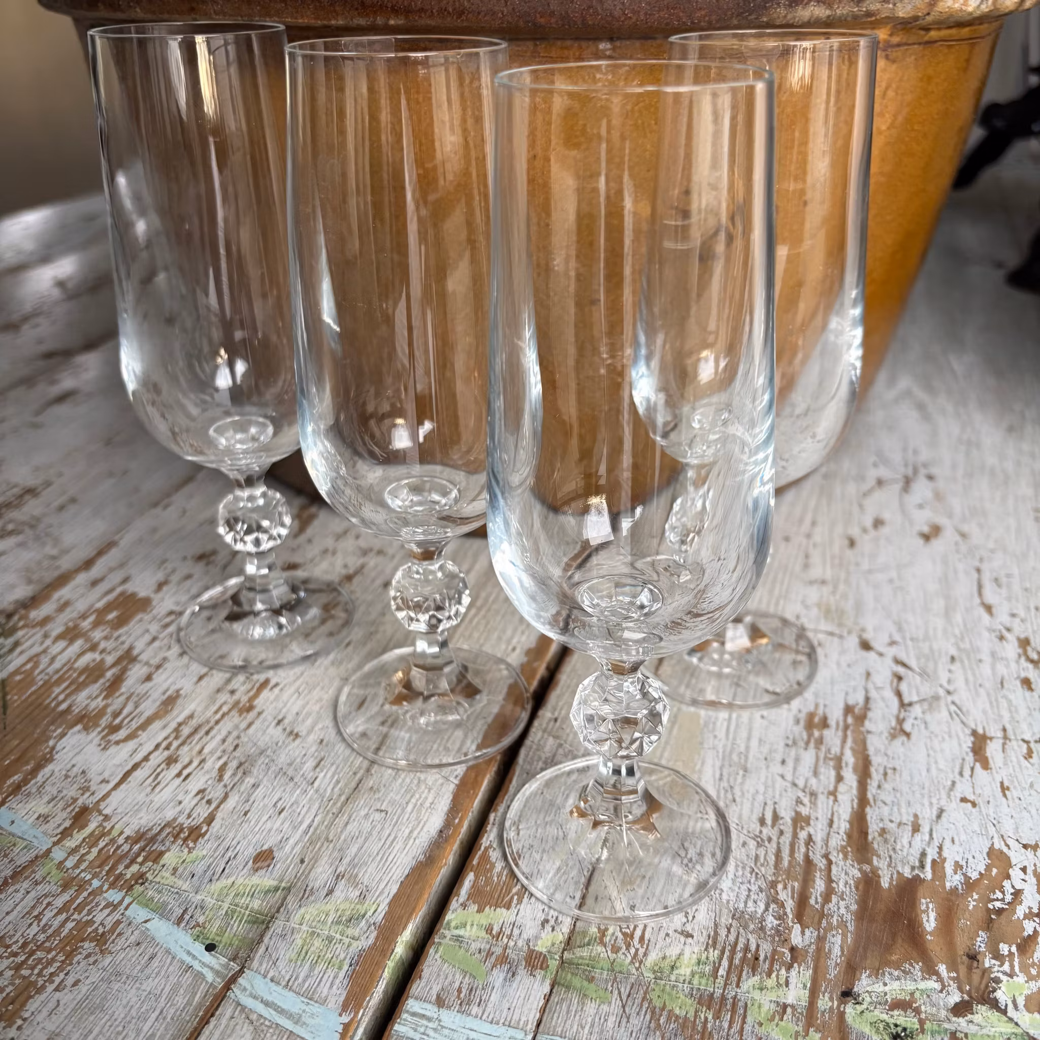 Fyra champagneglas i kristall. Med sin lilla slipade kula på halsen ger dessa glas, Claudia Bohemia, ett extra lyxigt intryck. Perfekta att plocka fram till både vardag och den intima festligheten. De är i bästa vintageskick och är som nya.
