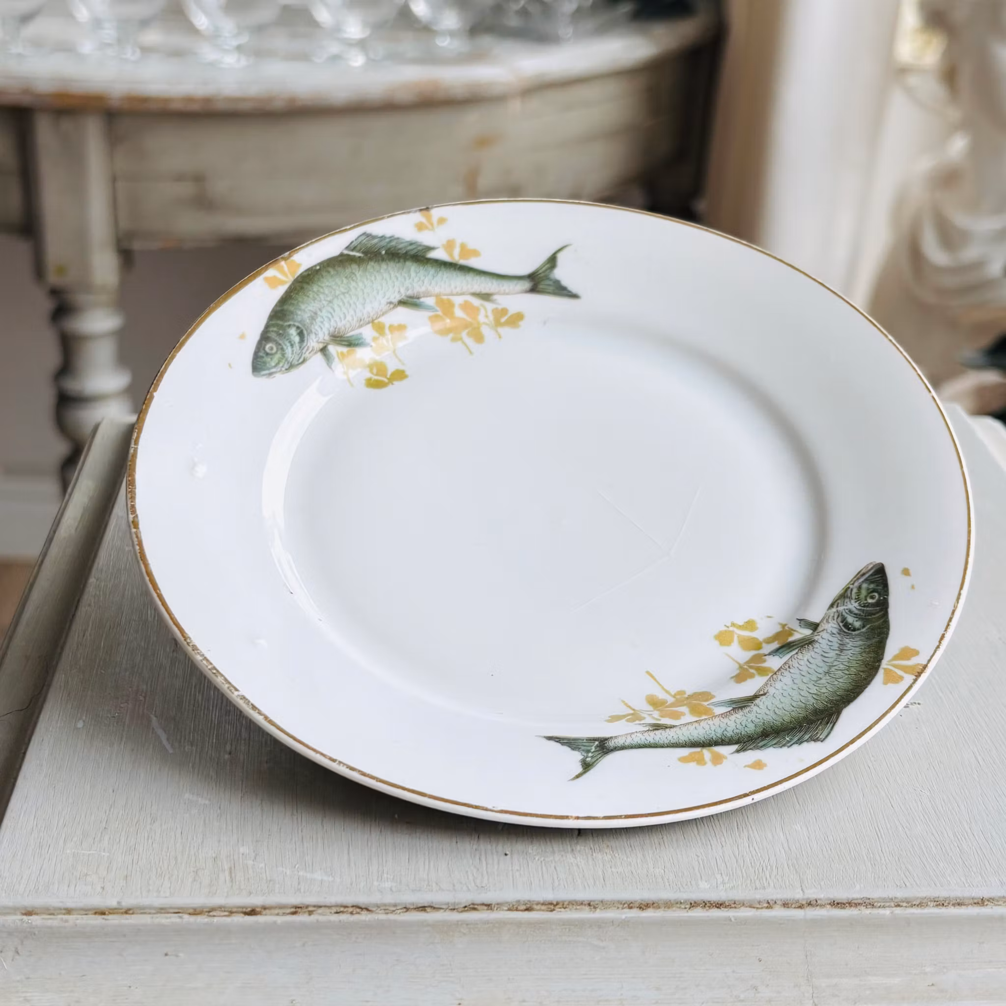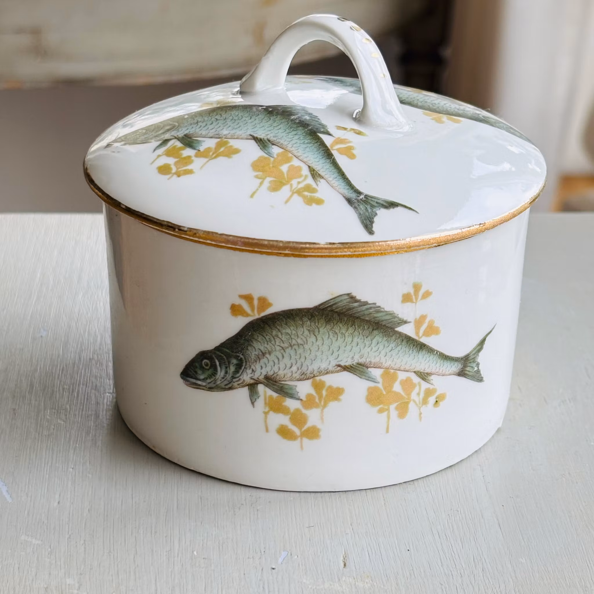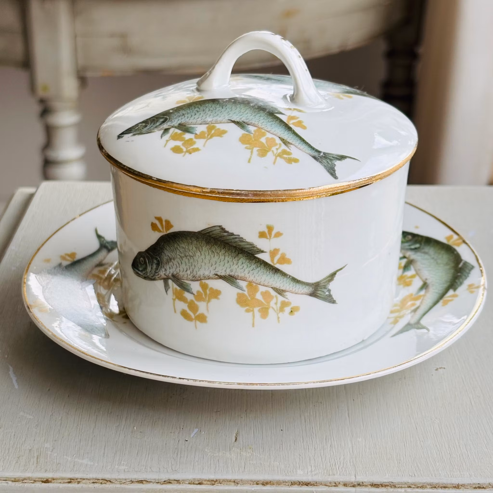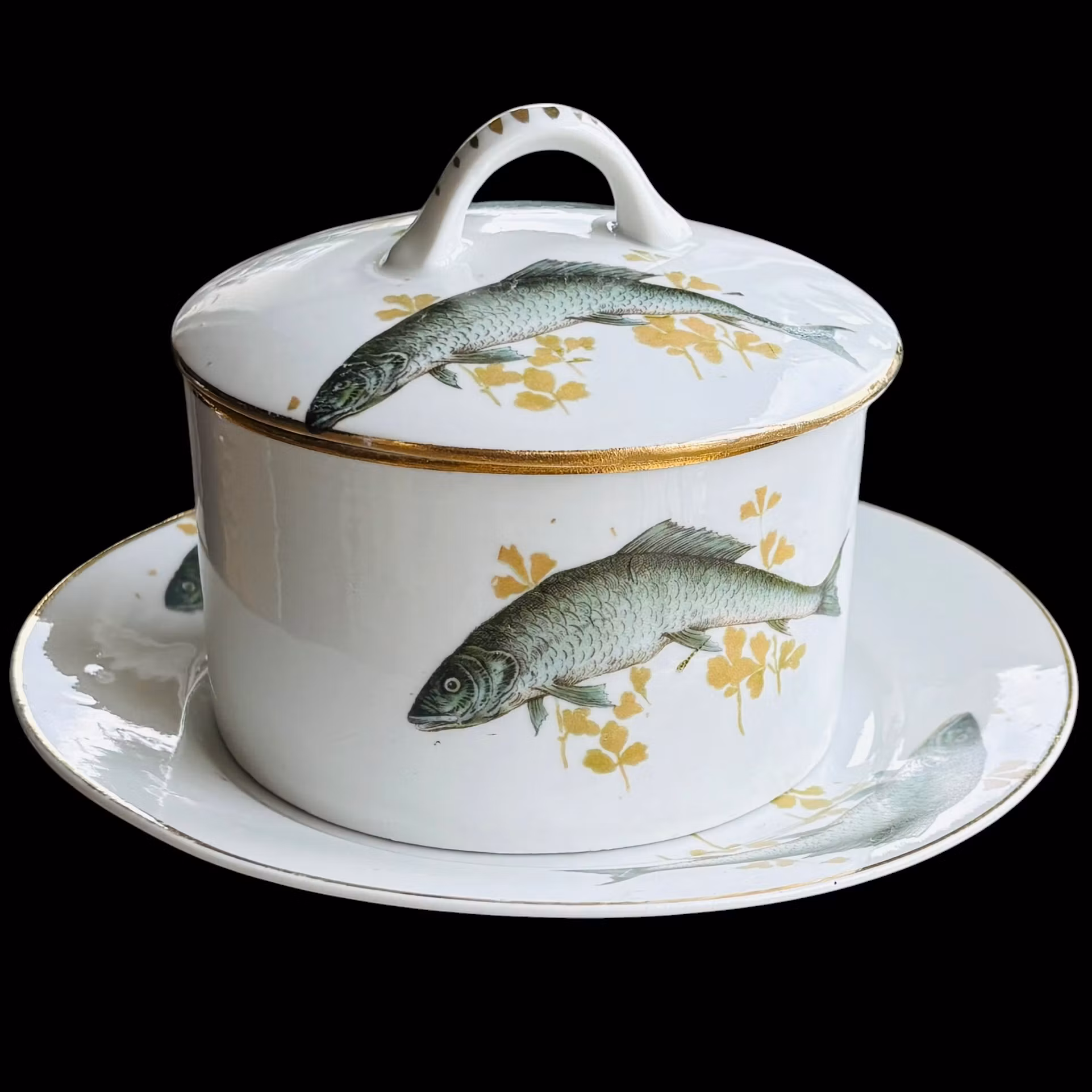 En originell och vacker skål dekorerad med fiskar och guldkant. Lock med samma dekor. Skålen står på ett fat med samma dekor av fiskar och guldkant. Så fin i grönblå och guldgula nyanser på vit botten. Ursprung okänt med förmodligen äldre tysk. Fint vintageskick.