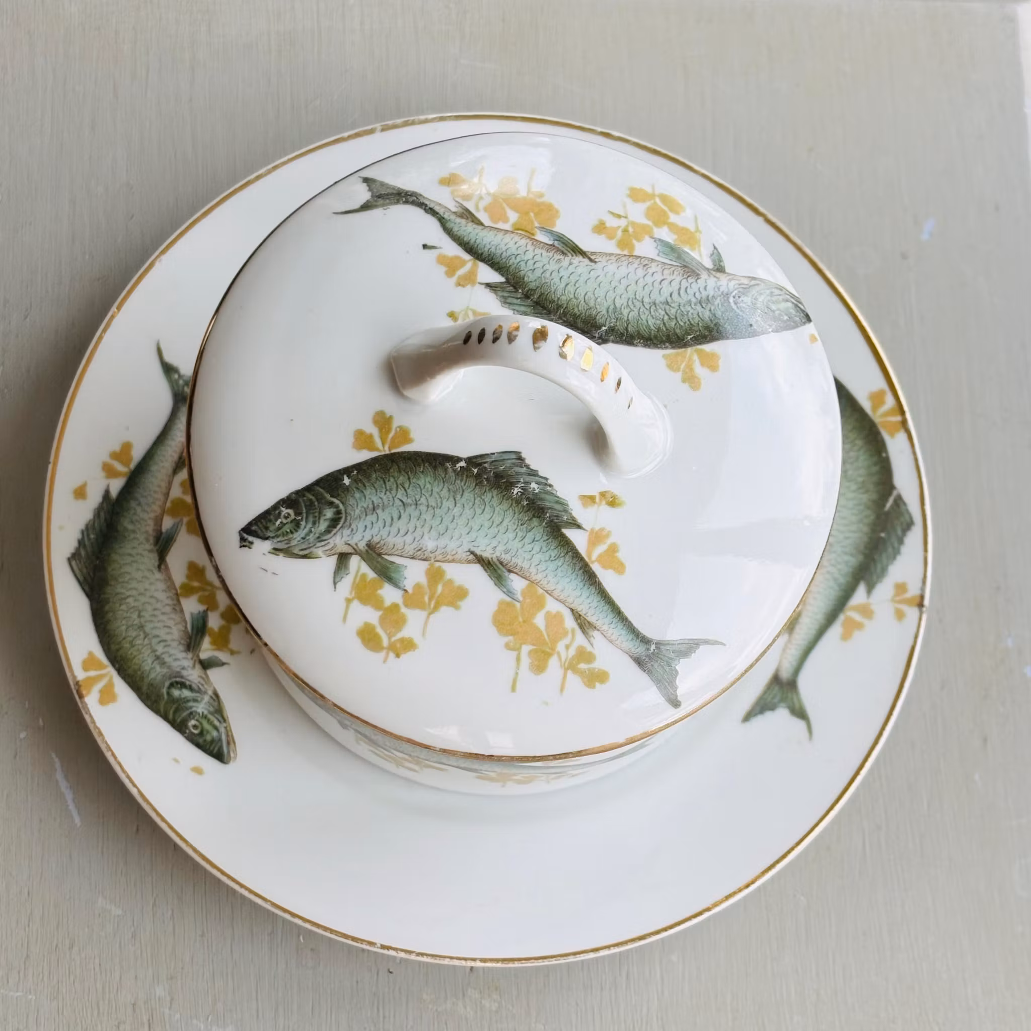 En originell och vacker skål dekorerad med fiskar och guldkant. Lock med samma dekor. Skålen står på ett fat med samma dekor av fiskar och guldkant. Så fin i gr