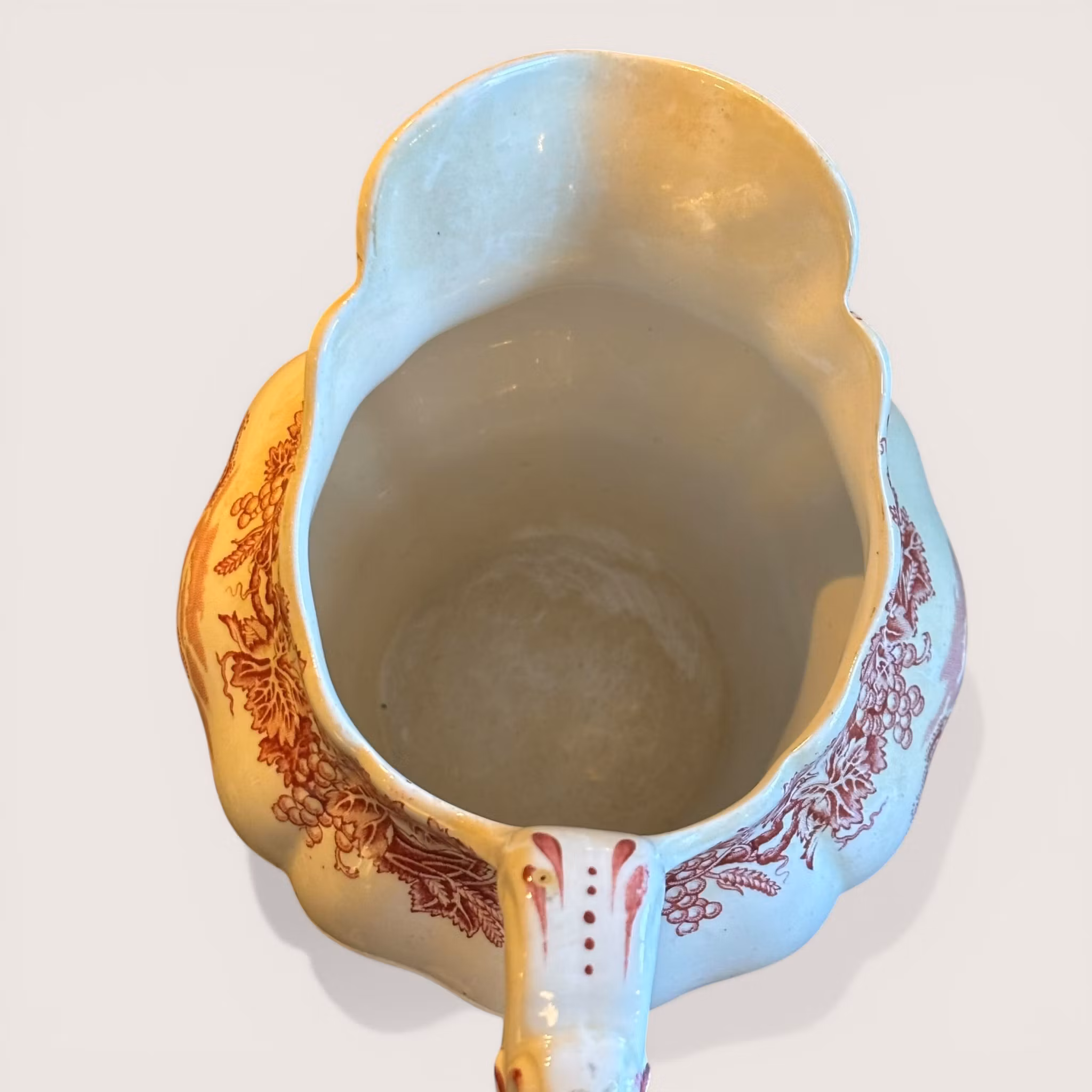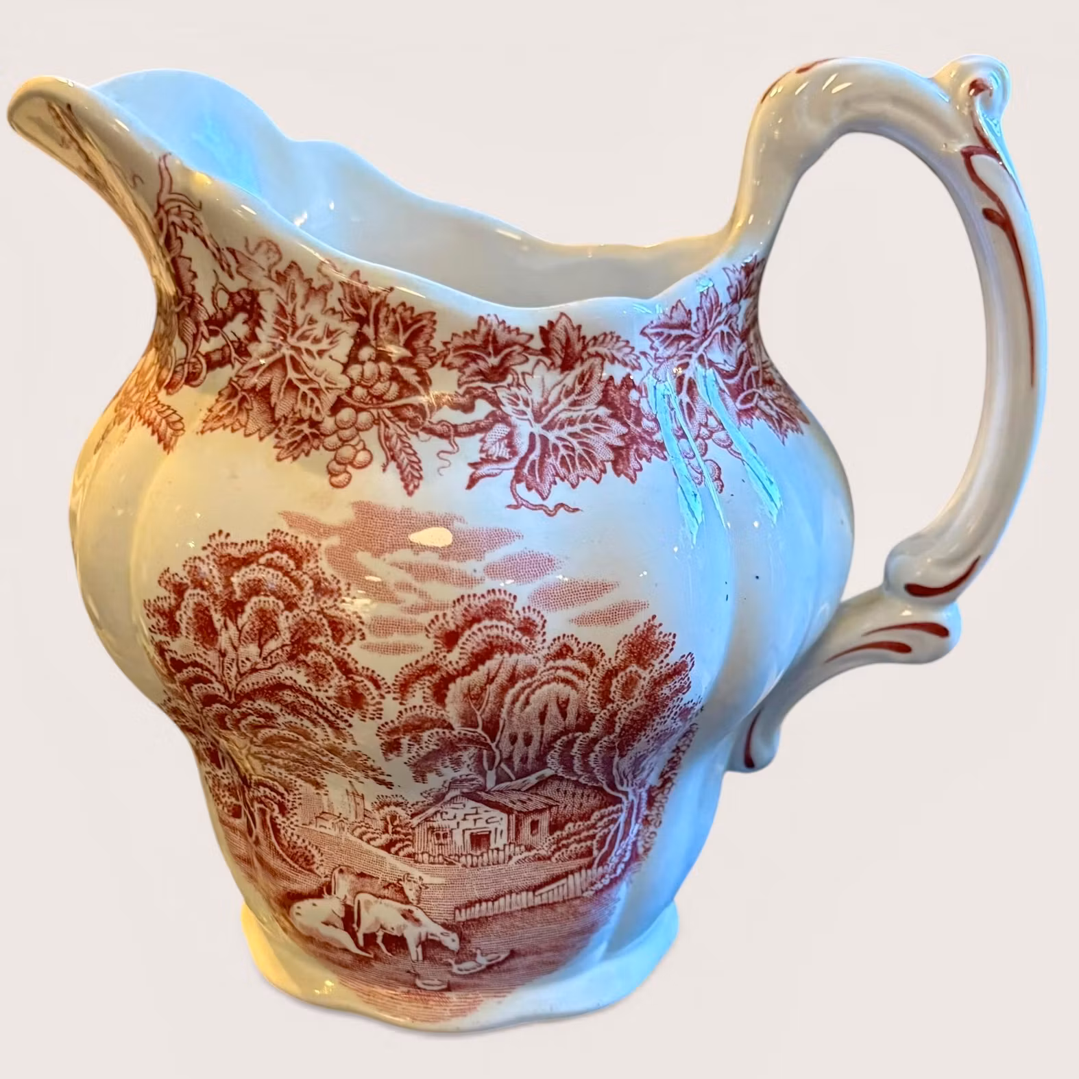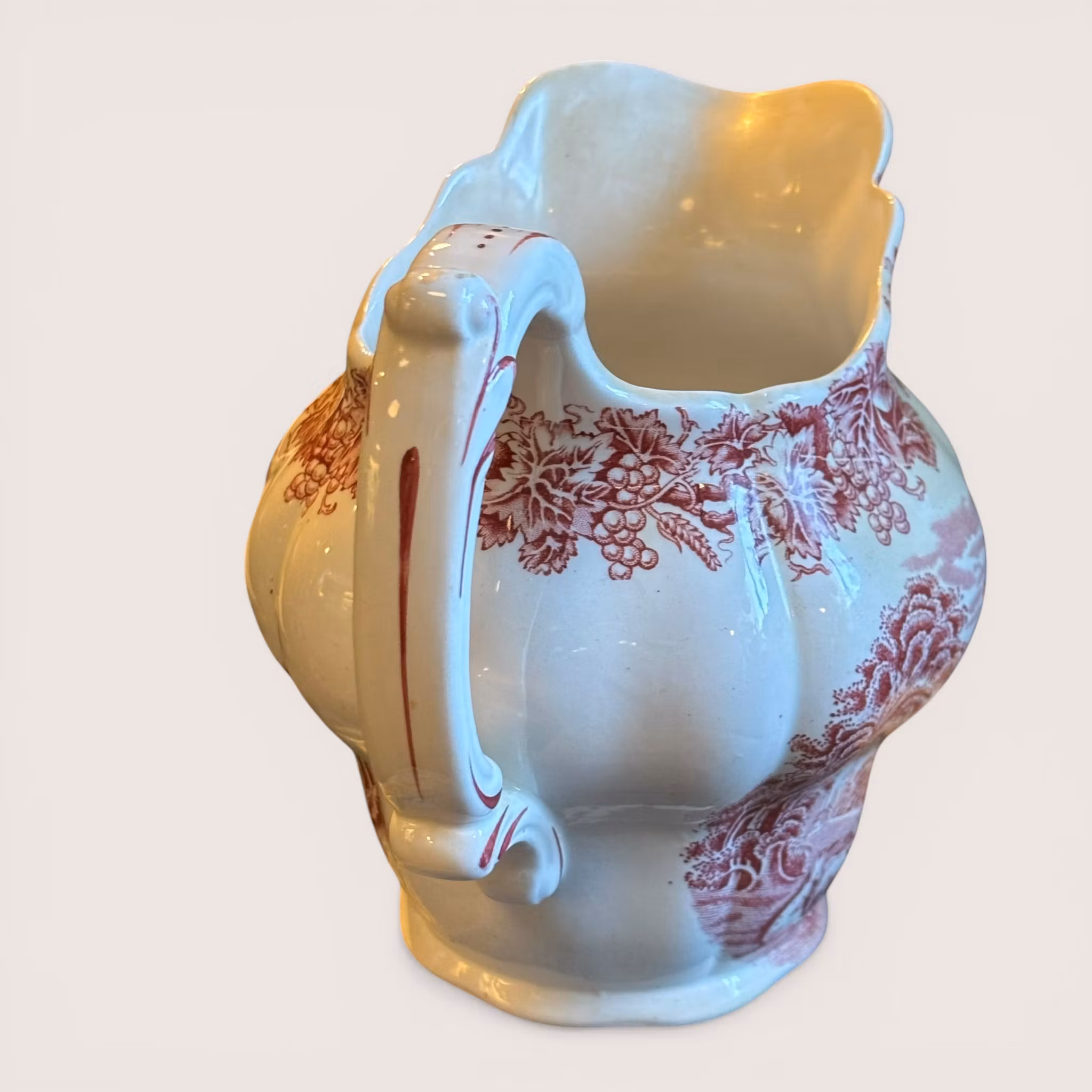 En raring till kanna från en av de finaste serierna tillverkade i England. Booths från English Scenery cirka 1950 tal i ovanlig färg, röd på vit botten. Landskap och vinrankor dekorerar kannan och handtaget har en elegant form. Denna kanna är av större mått och passar utmärkt till vatten, saft eller liknande. Den är i exceptionellt bra skick för sin ålder. Vit, glansig och utan skador.