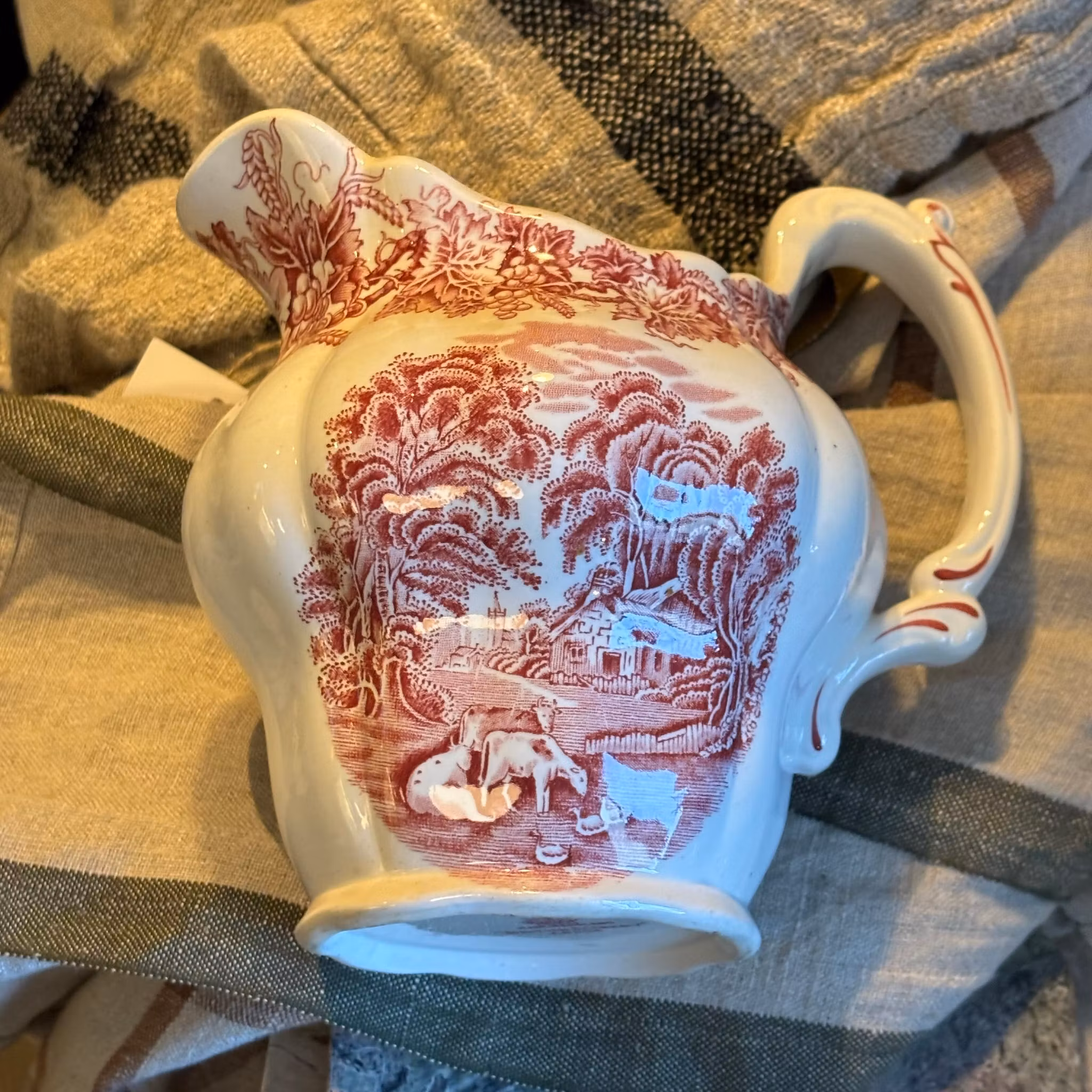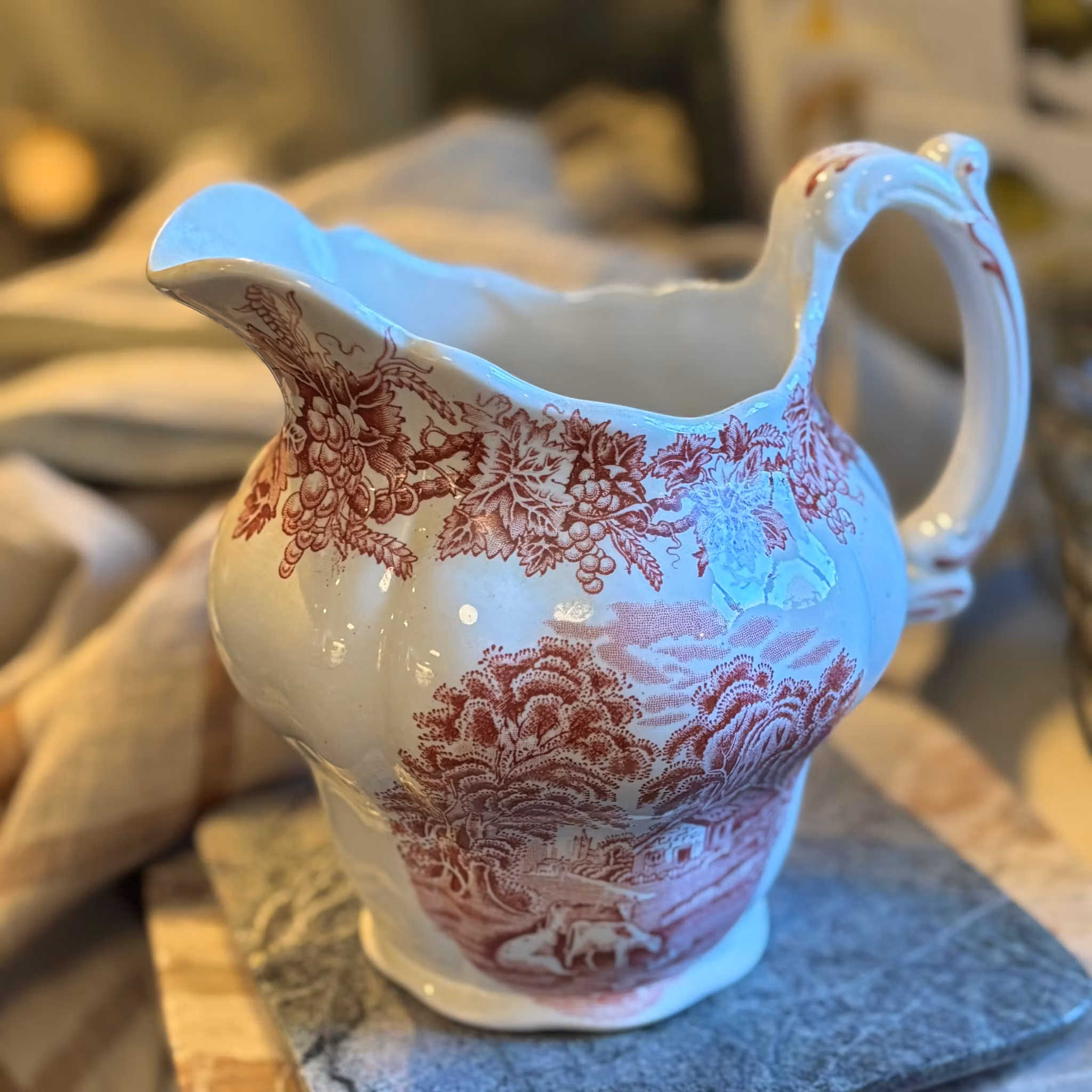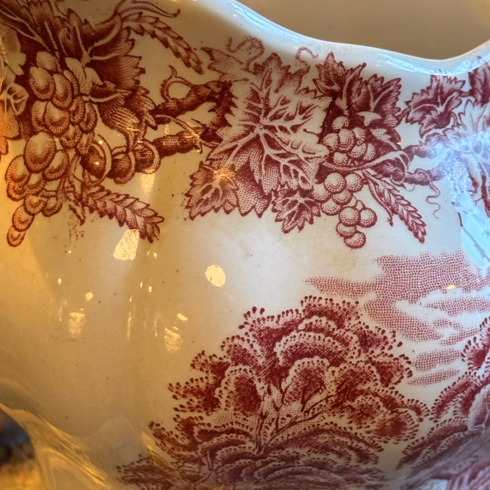 En raring till kanna från en av de finaste serierna tillverkade i England. Booths från English Scenery cirka 1950 tal i ovanlig färg, röd på vit botten. Landskap och vinrankor dekorerar kannan och handtaget har en elegant form. Denna kanna är av större mått och passar utmärkt till vatten, saft eller liknande. Den är i exceptionellt bra skick för sin ålder. Vit, glansig och utan skador.