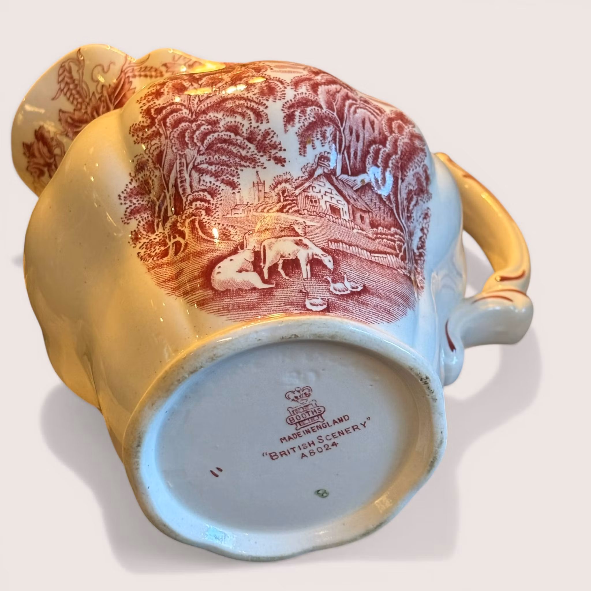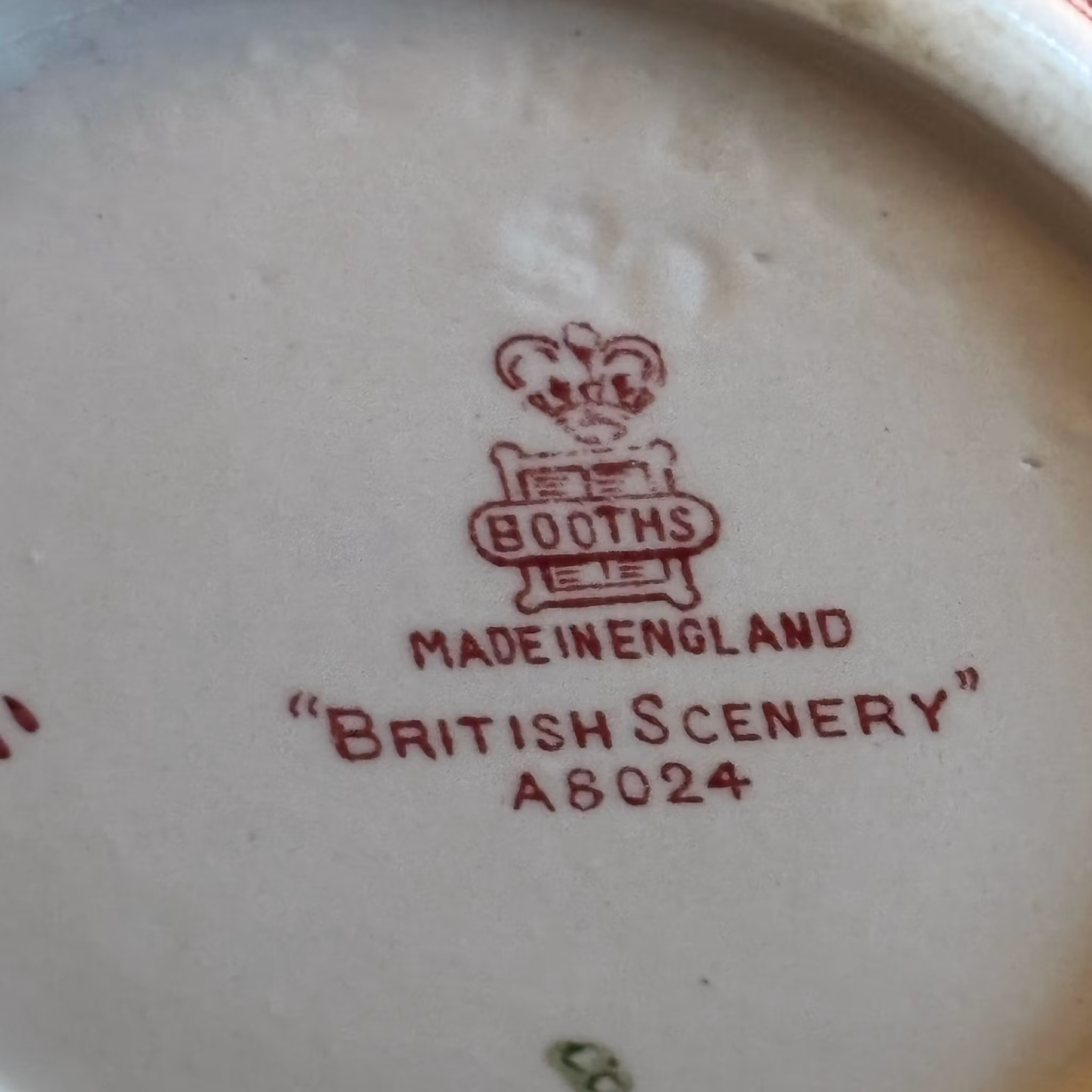En raring till kanna från en av de finaste serierna tillverkade i England. Booths från English Scenery cirka 1950 tal i ovanlig färg, röd på vit botten. Landska