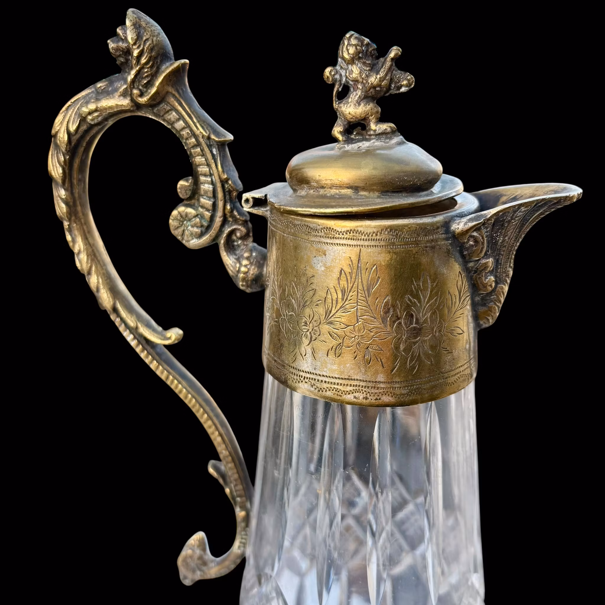 En unik och fantastiskt vacker vinkaraff från tidigt 1900-tal. Karaffen är i kristallglas och belagd metall. Dekorerat handtag med lejonhuvud. Inropad på auktio