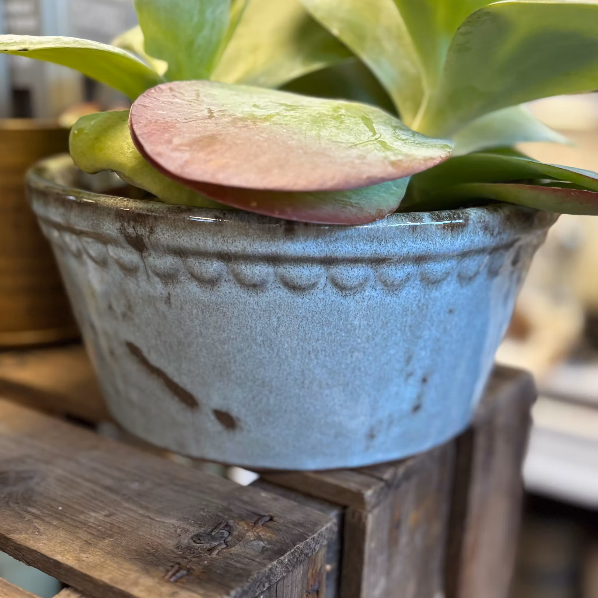 Den perfekta krukan när du vill sätta ihop en liten grupp av växter. Snygg också på bordet då den är lite lägre. Kruka av stengods och finns i tre olika glaserade färger som alla är unika i sin färgskiftning. Går i ljust mintgrön, ljusblå grön och ljusgrön. En liten spetskant höjer finheten i dessa lite extra. Lagom för 2 växter tex cyklamen eller flera mindre som hyacinter, kaktusar eller vårlök.