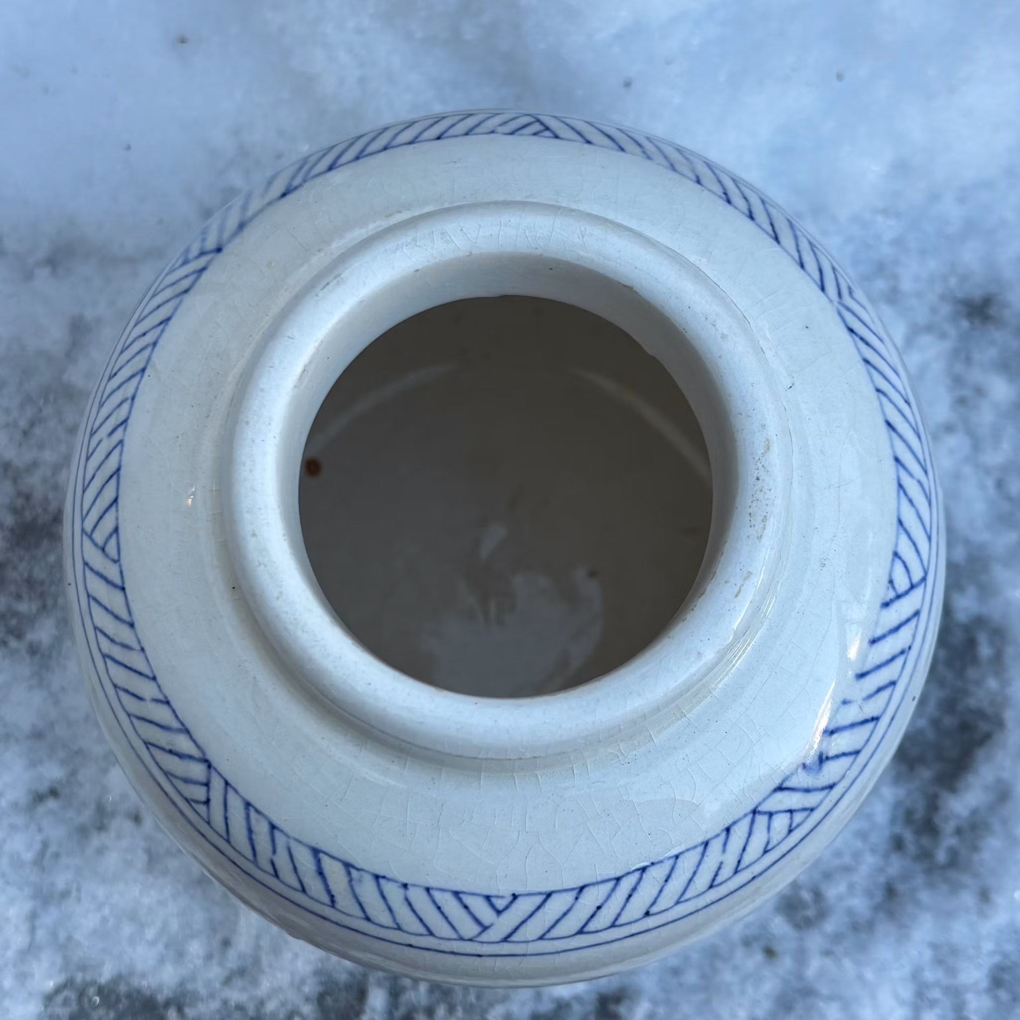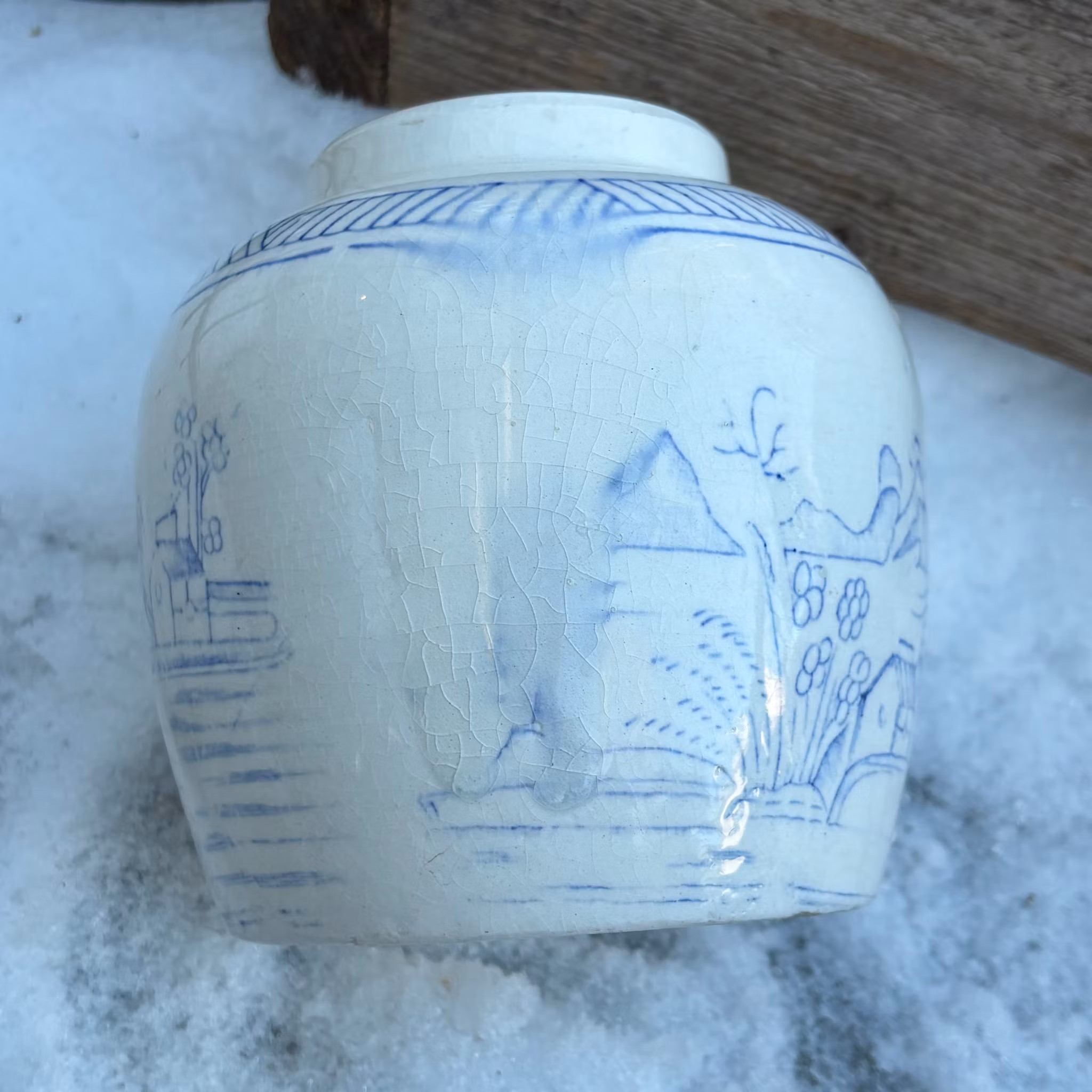 En riktig liten raring, eller inte så liten ändå. Ett ingefärskrus eventuellt från Korea 1800-1900-tal. Svårt att avgöra ålder men den är iallafall väldigt fin. Ett krus som förr användes för att köpa och förvara ingefära i. Den är i vitt porslin med blått mönster av ett landskap. Skicket är fint, inga nagg eller andra skador men i tillverkning har glasyren runnit lite men det tycker jag bara skapar ännu mer originalitet. Fin som vas eller förvaring i köket. Tänk dig din sommarbukett nyplockade från trädgården och stående i denna vas i motljus...say no more..