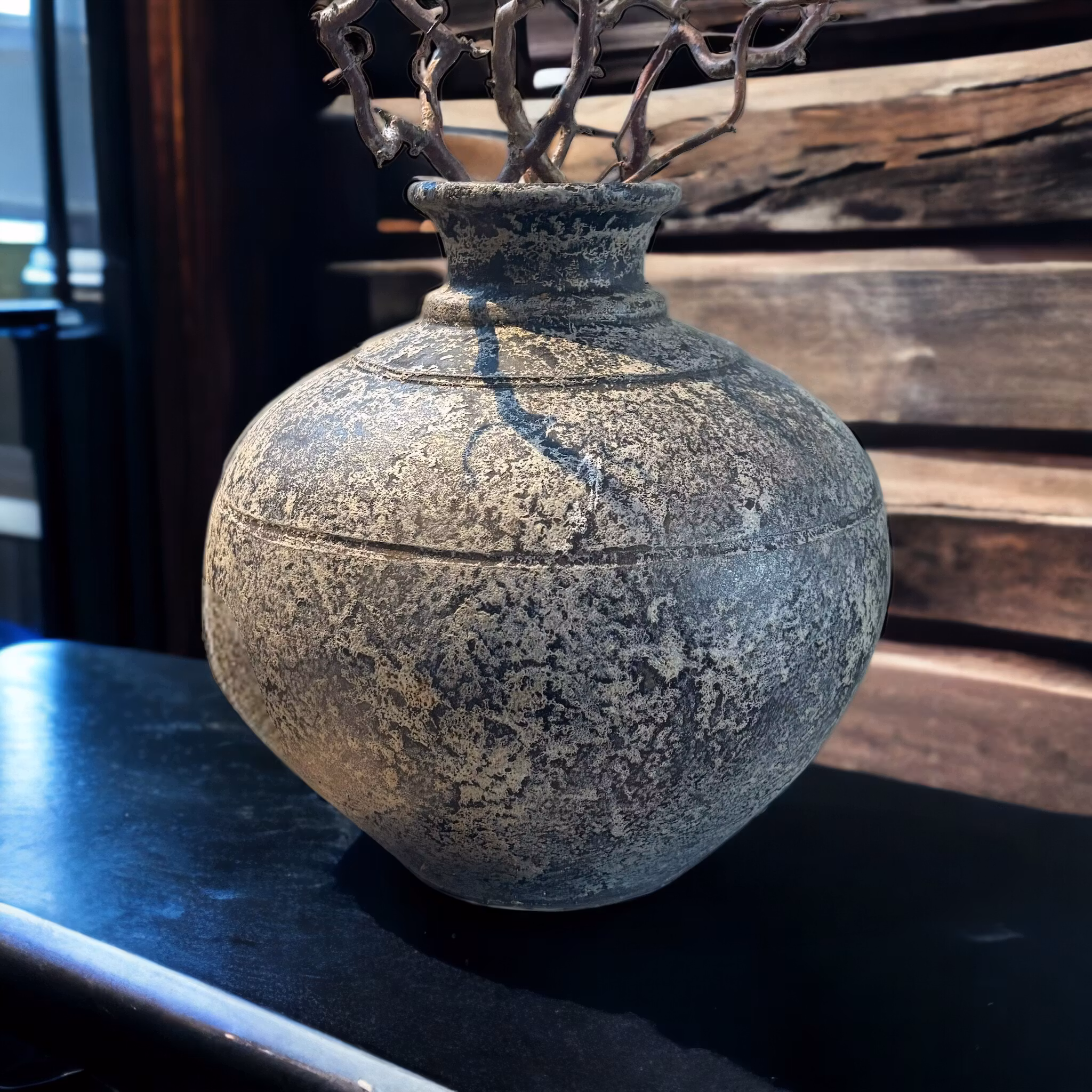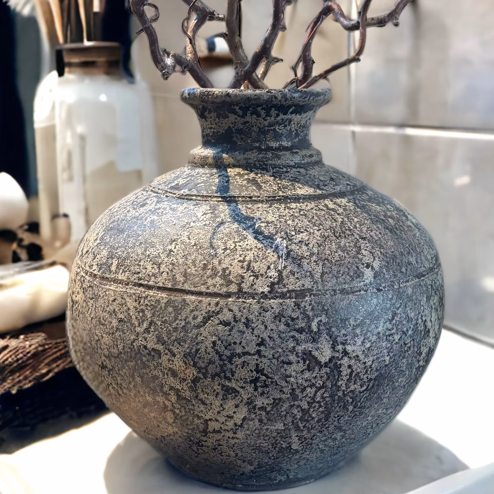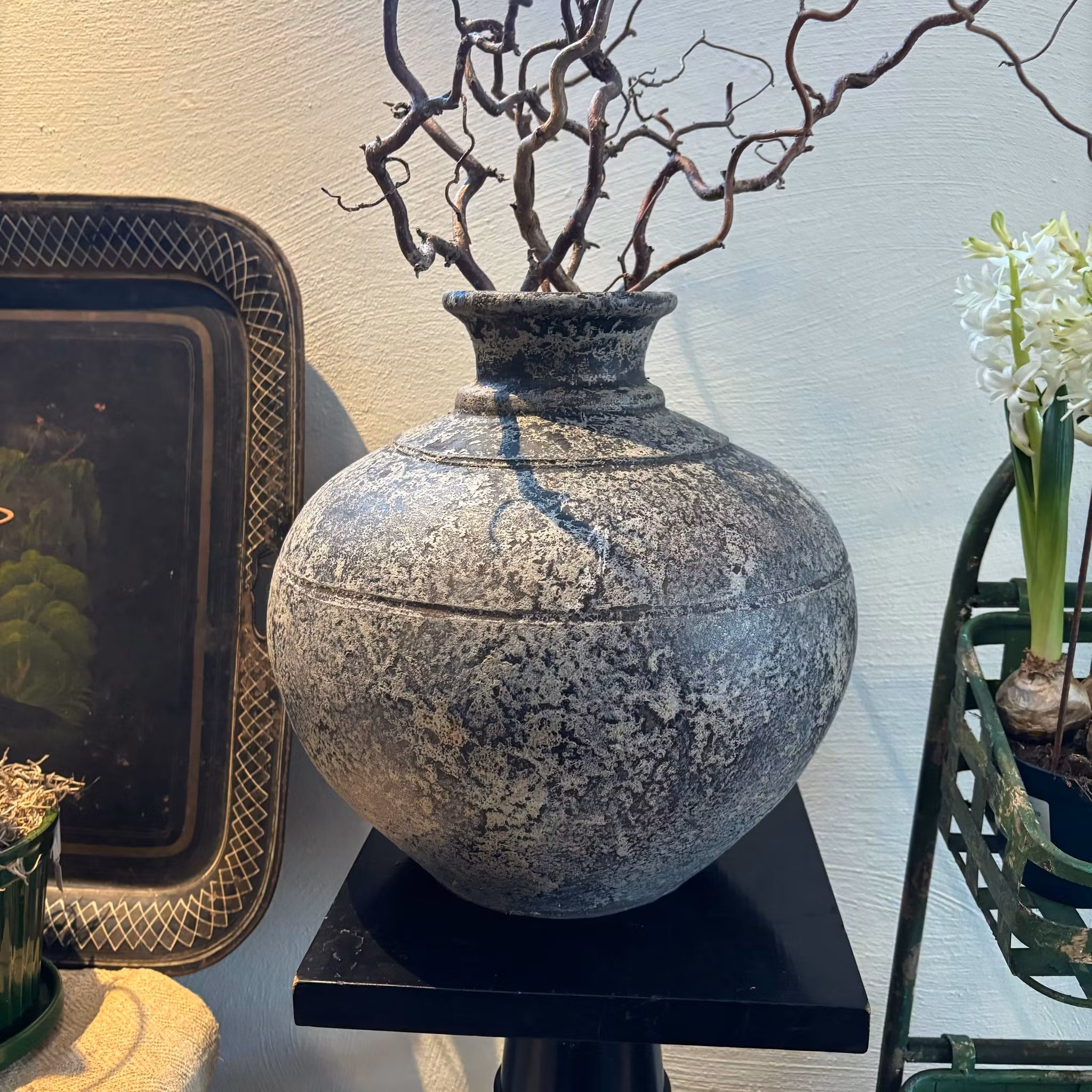 En urna med härligt rund kropp och vacker yta. Den smala halsen gör det enkelt att sätta några få kvistar i den. Tillverkad i formmassa och målad i melerade fär