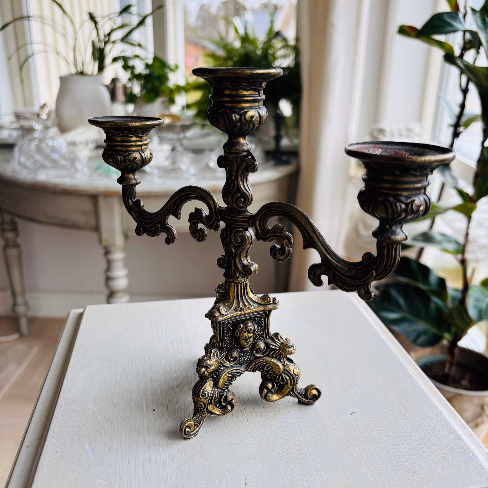 En trearmad och trefotad ljusstake i gulsvart metall. En unik och väldigt vacker äldre modell med dekor av ansikten och lejon på fötterna. Ljusstaken står stabilt med sin tyngd och lyser vackert var du än placerar den. Den har tecken på tidigare användning men det är främst stearin som går att rengöra mer om så önskas. Ursprung okänt.