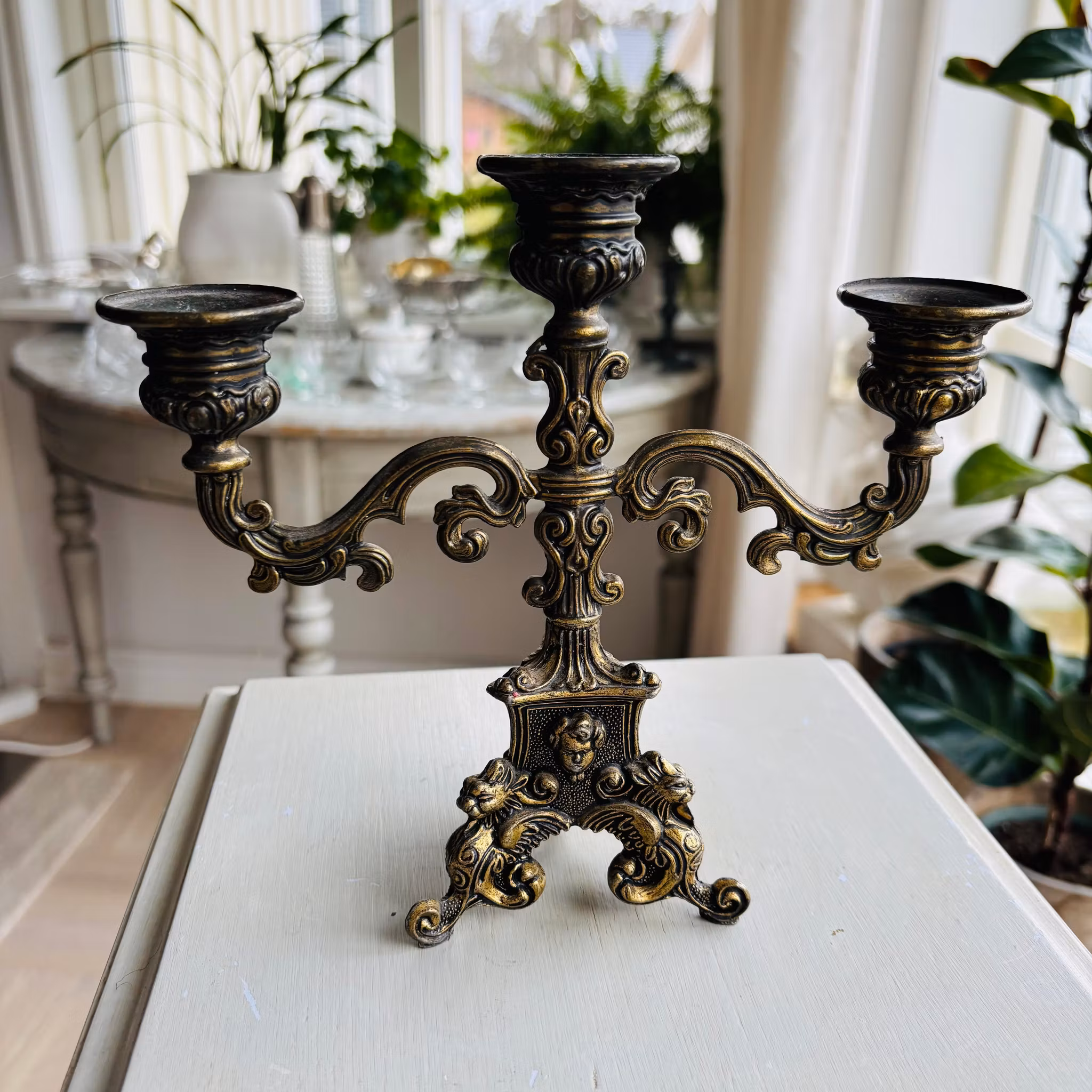 En trearmad och trefotad ljusstake i gulsvart metall. En unik och väldigt vacker äldre modell med dekor av ansikten och lejon på fötterna. Ljusstaken står stabi
