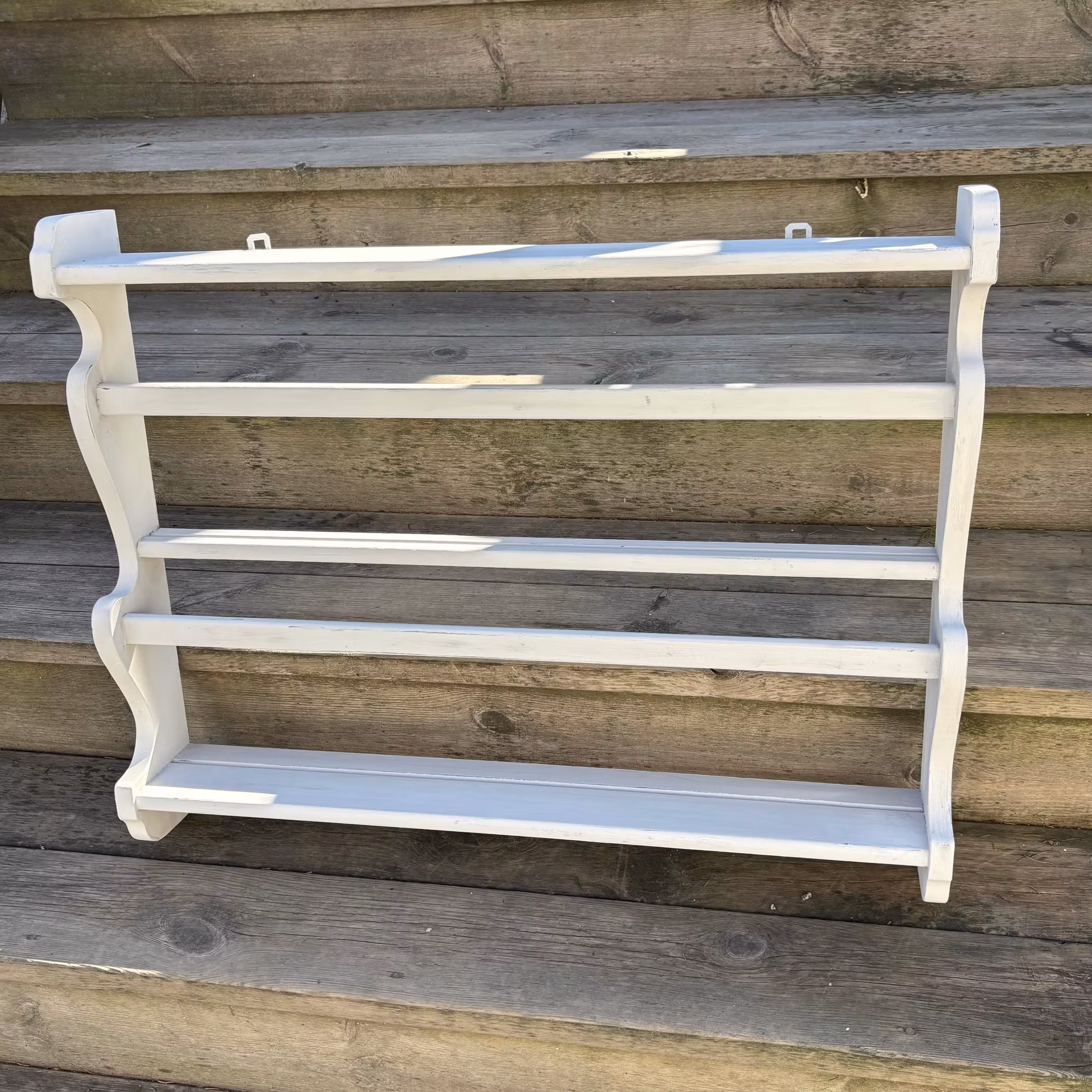 En tallrikshylla i trä, målad i en vit/grå kulör med en touch av svart vax för äldre look. En skåra i de båda delarna gör det enkelt att sätta tallrikar men fun