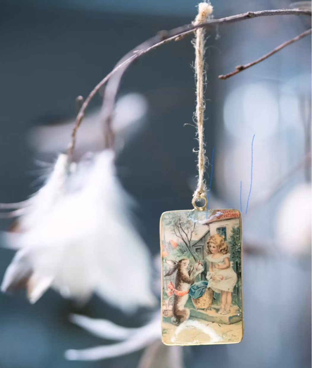 Påskdekoration med nostalgikänsla. Vintagemotiv av kaniner på emaljhänge. Fina i påskriset eller på ett paket. Finns med tre olika motiv. Om du önskar något spe