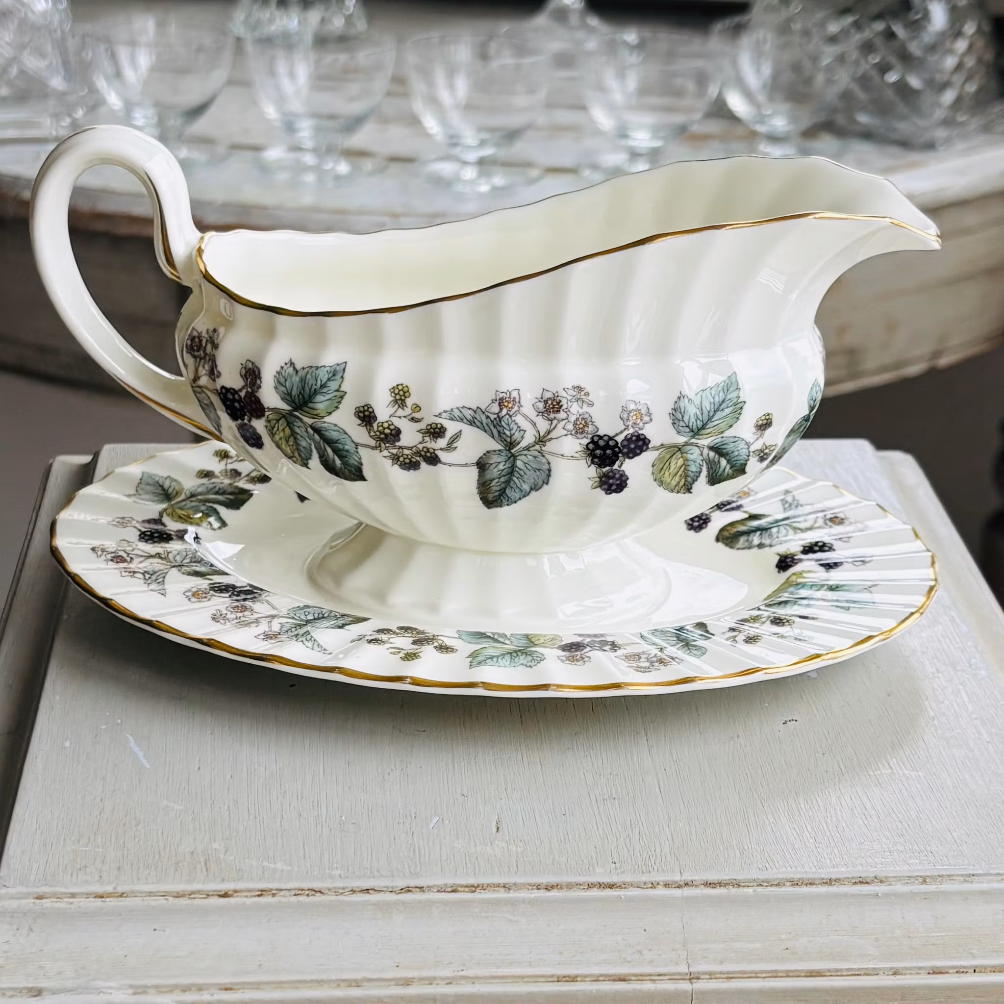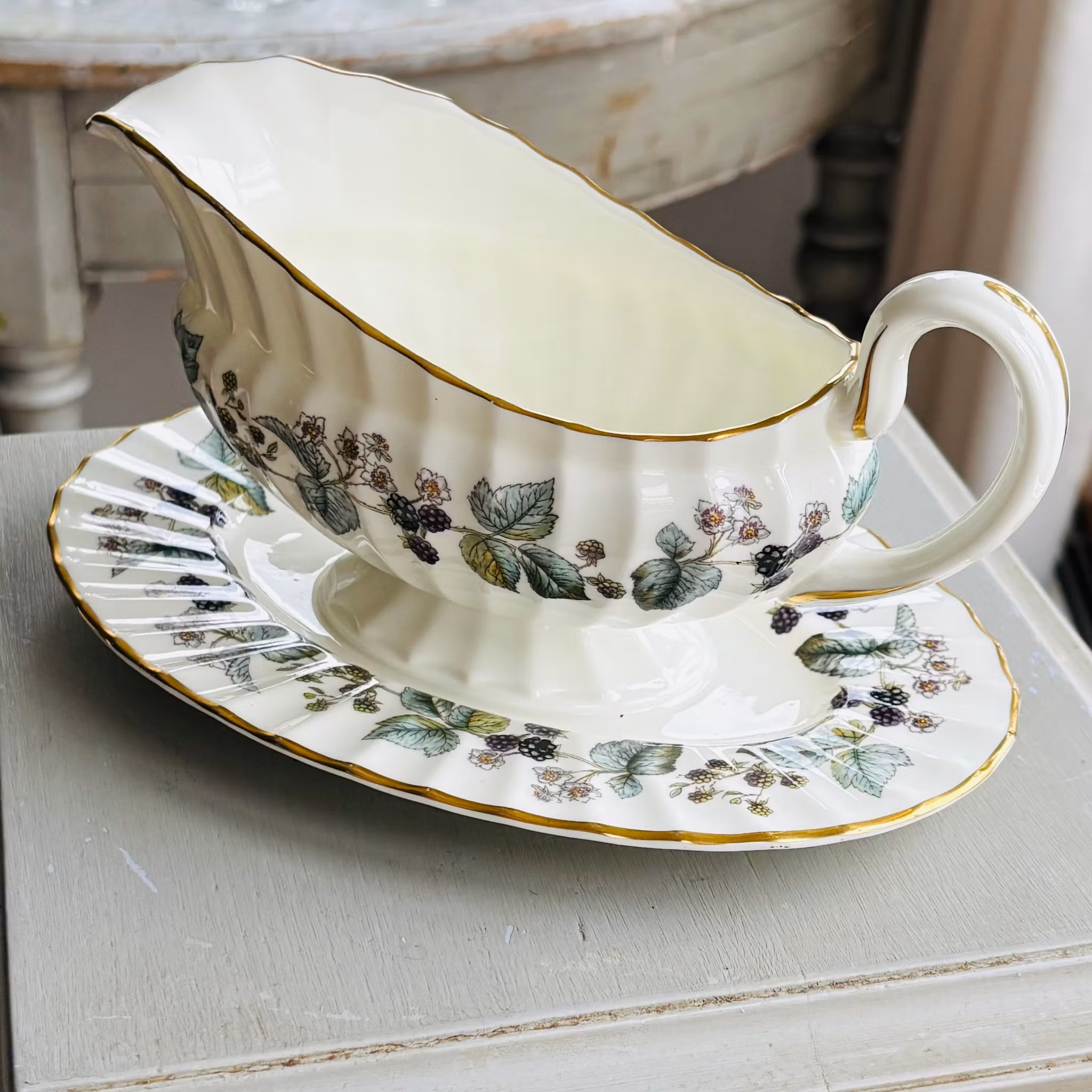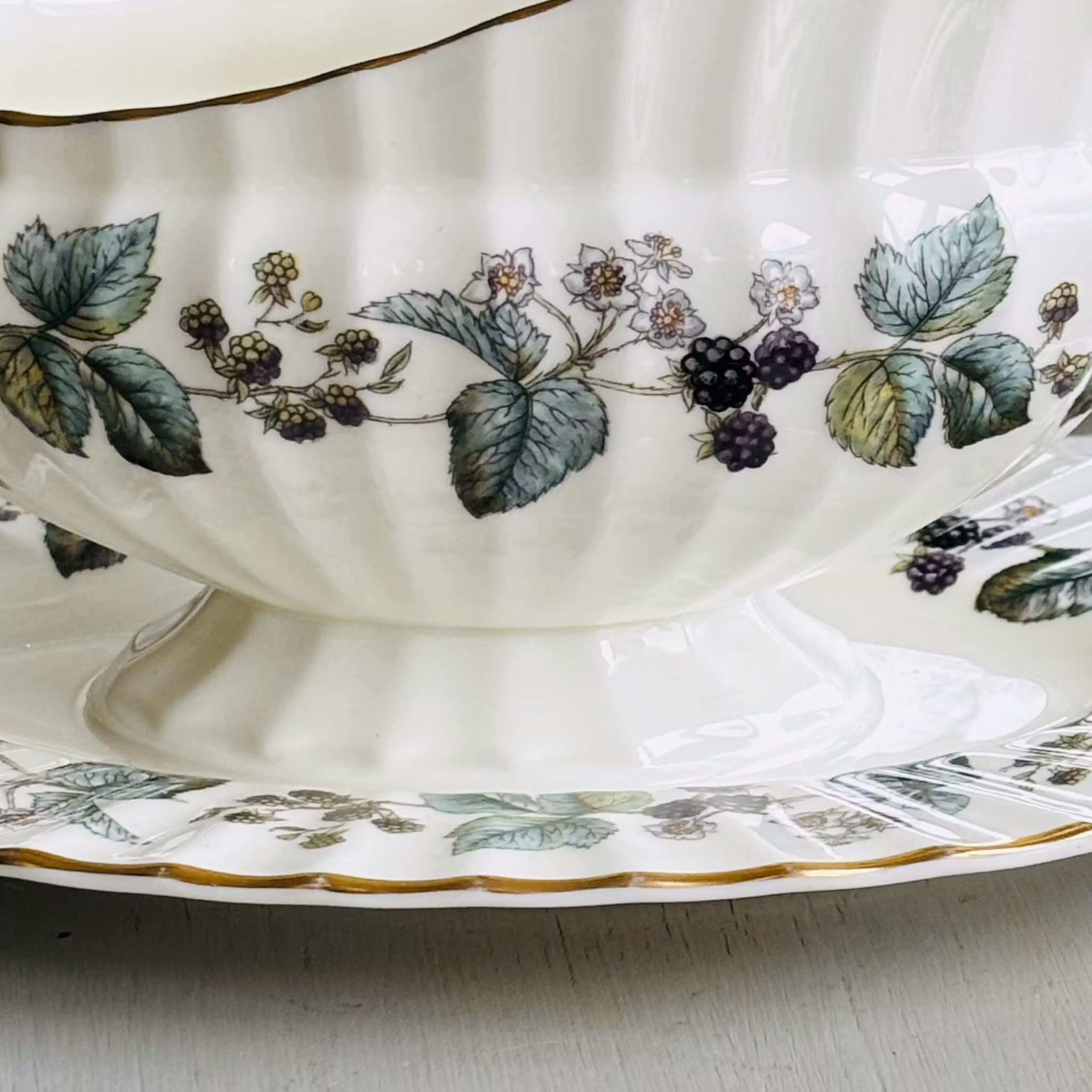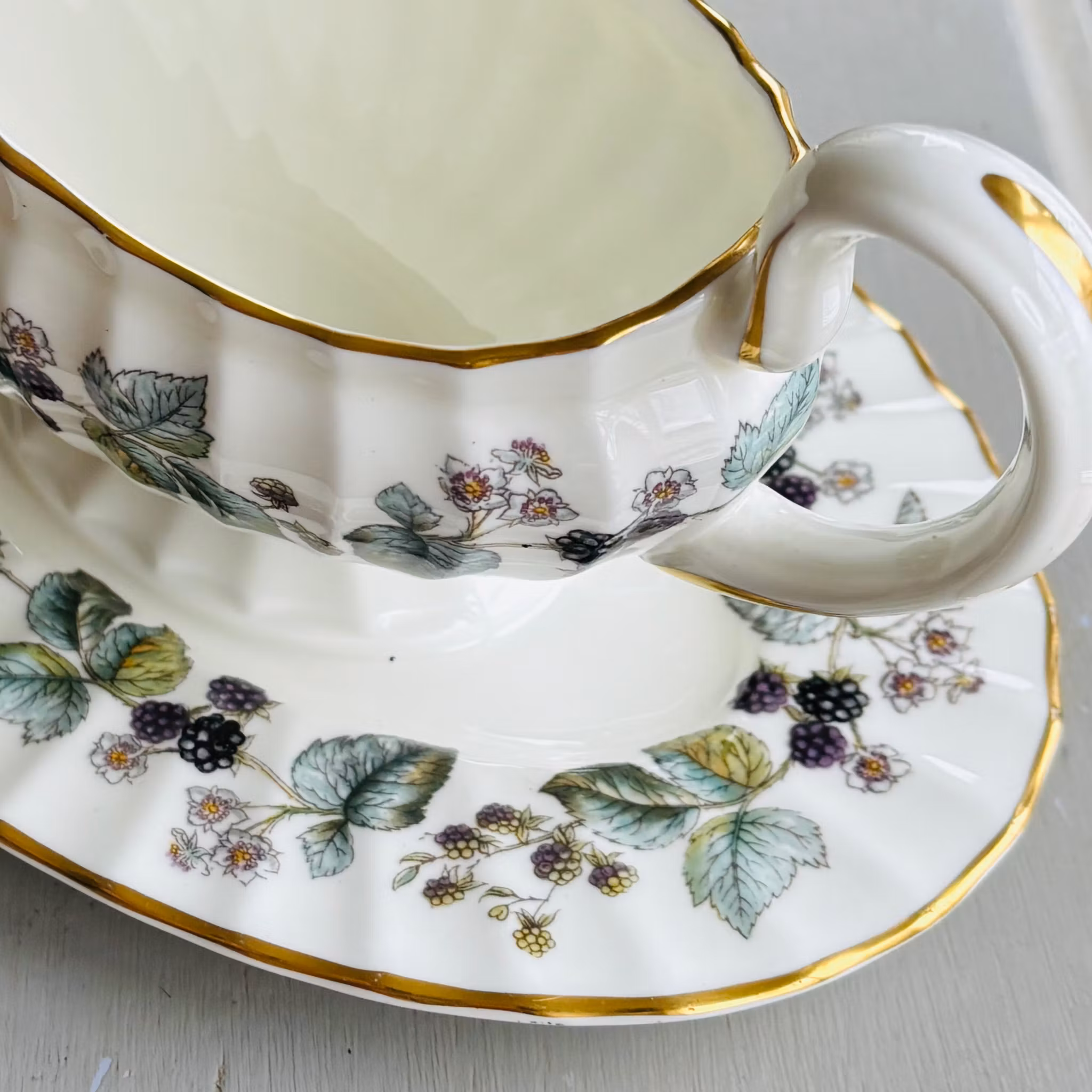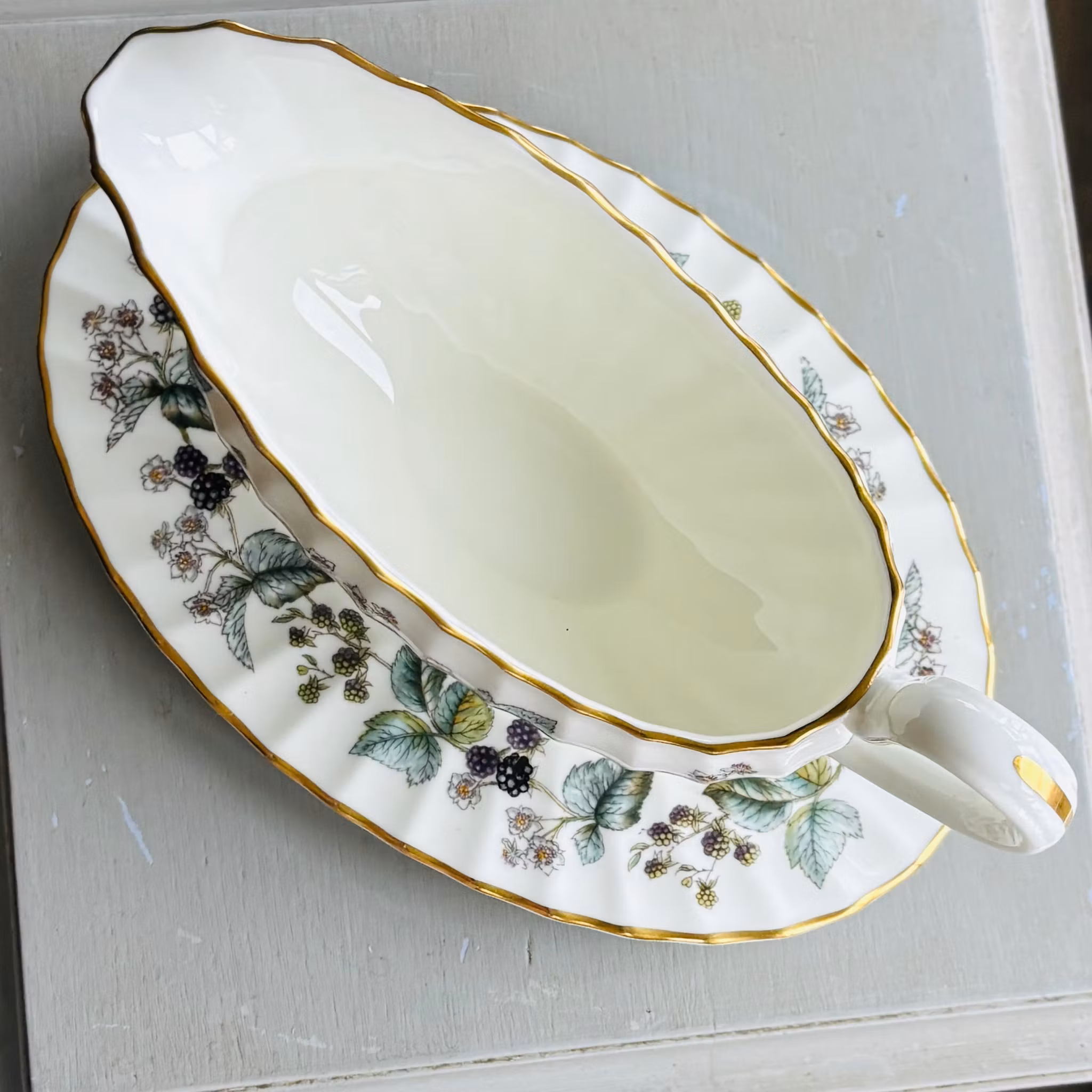 Ett fantastiskt exemplar av såssnipan Lavinia dekorerad med mullbär och bladverk. Färgskalan är vackert nedtonad och prydd med kant av guld. Tillverkad i benporslin där både fat och snipa är veckad. Snipan sitter fast i fatet. Finaste vintage skick som ny från Royal Worcester England.