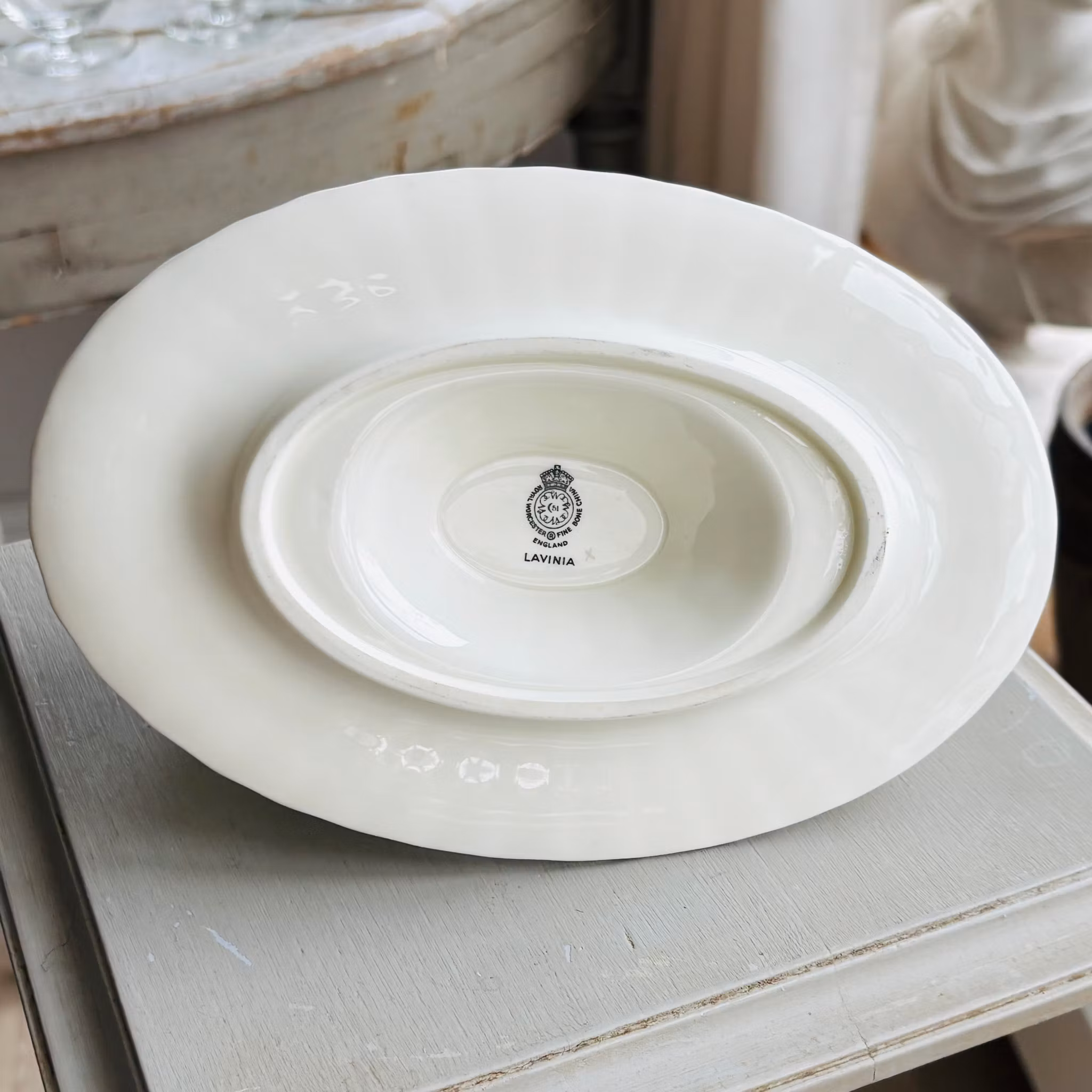 Ett fantastiskt exemplar av såssnipan Lavinia dekorerad med mullbär och bladverk. Färgskalan är vackert nedtonad och prydd med kant av guld. Tillverkad i benpor