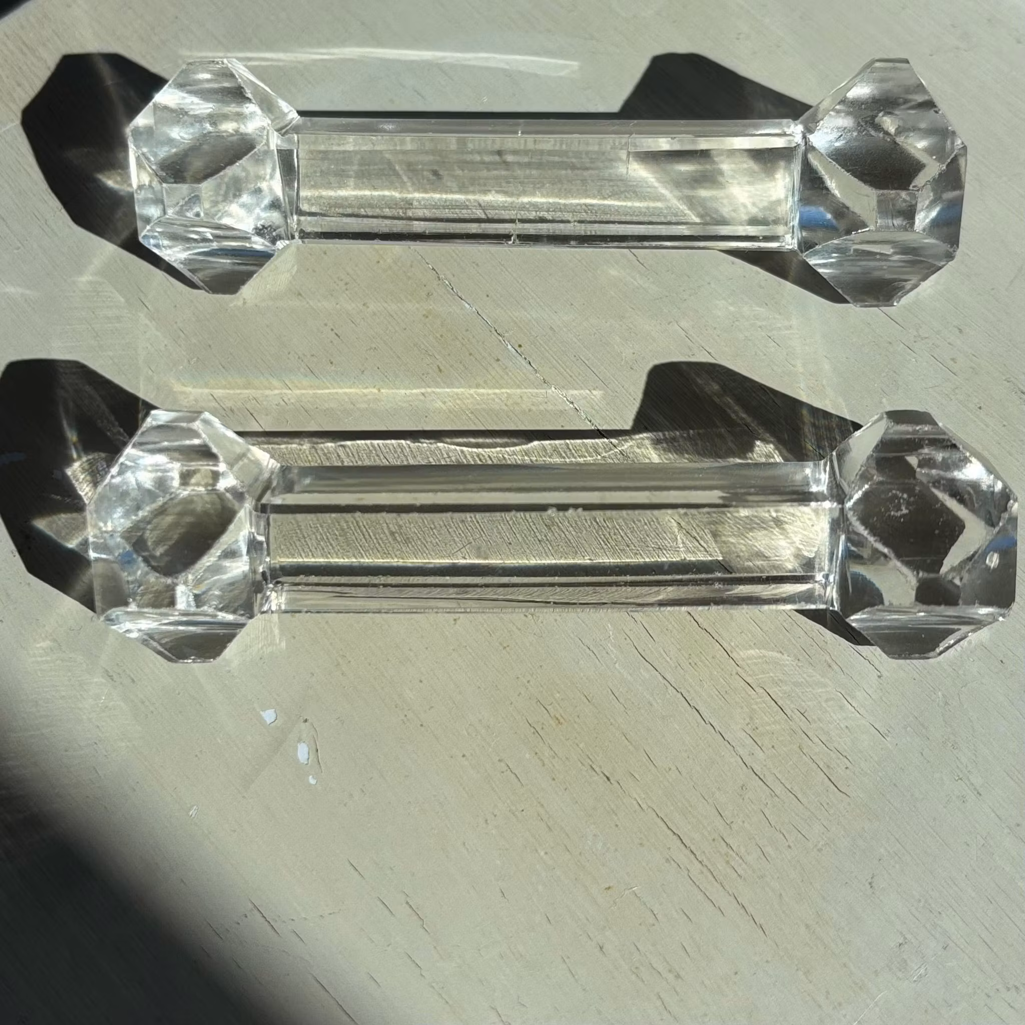 Fina smörtaxar i kristallglas. Stora med många slipade kanter som gör dessa till ett smycke både i köket och på bordet. Du vilar bestick, smörkniv eller liknande på dem så att du slipper kladd på bordet eller duken.