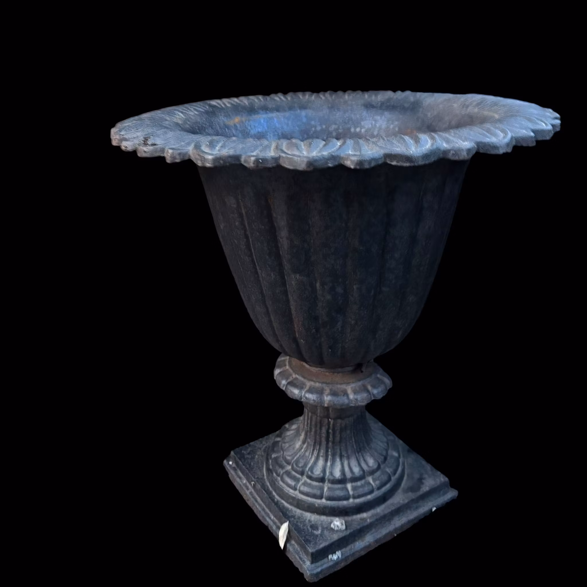 En klassisk stilren gjutjärnsurna med fyrkantig fot och rund kruka. Överkant med vackert mönster. Svärtad i svart nyans. Bra bevarat skick. Små märken och ytros