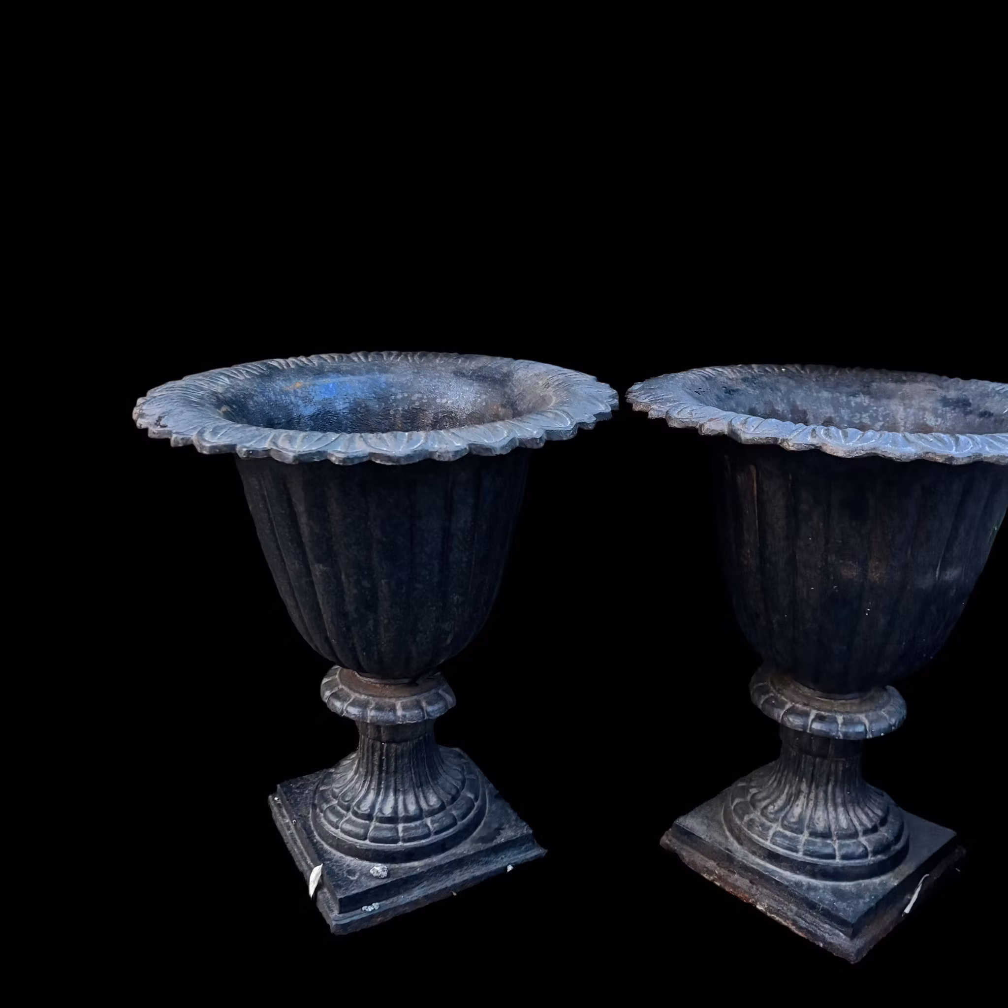 En klassisk stilren gjutjärnsurna med fyrkantig fot och rund kruka. Överkant med vackert mönster. Svärtad i svart nyans. Bra bevarat skick. Små märken och ytrost finns som visar historiens användning men den är i fint vintage skick. Perfekta för alla årets växter och klarar av att stå utomhus året runt. Finns 2 stycken som är finast som set men du kan köpa en om du önskar, priset är per styck.