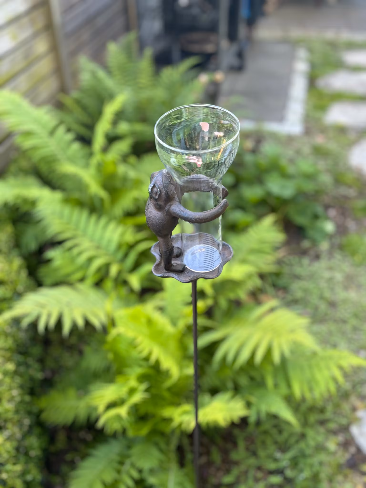 Vem vill inte ha något vackert samtidigt som det är praktiskt…En regnmätare i glas som hålls av en groda stående på ett näckrosblad i gjutjärn. Rundstav av järn