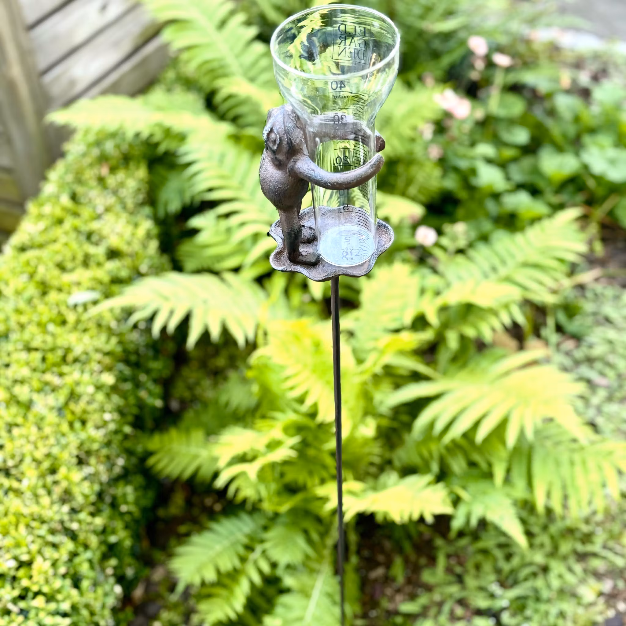 Vem vill inte ha något vackert samtidigt som det är praktiskt…En regnmätare i glas som hålls av en groda stående på ett näckrosblad i gjutjärn. Rundstav av järn som du enkelt trycker ner i marken med foten. Då den har två pinnar längst ner står den väldigt stadigt. Grodan kommer separat och skruvas på pinnen.