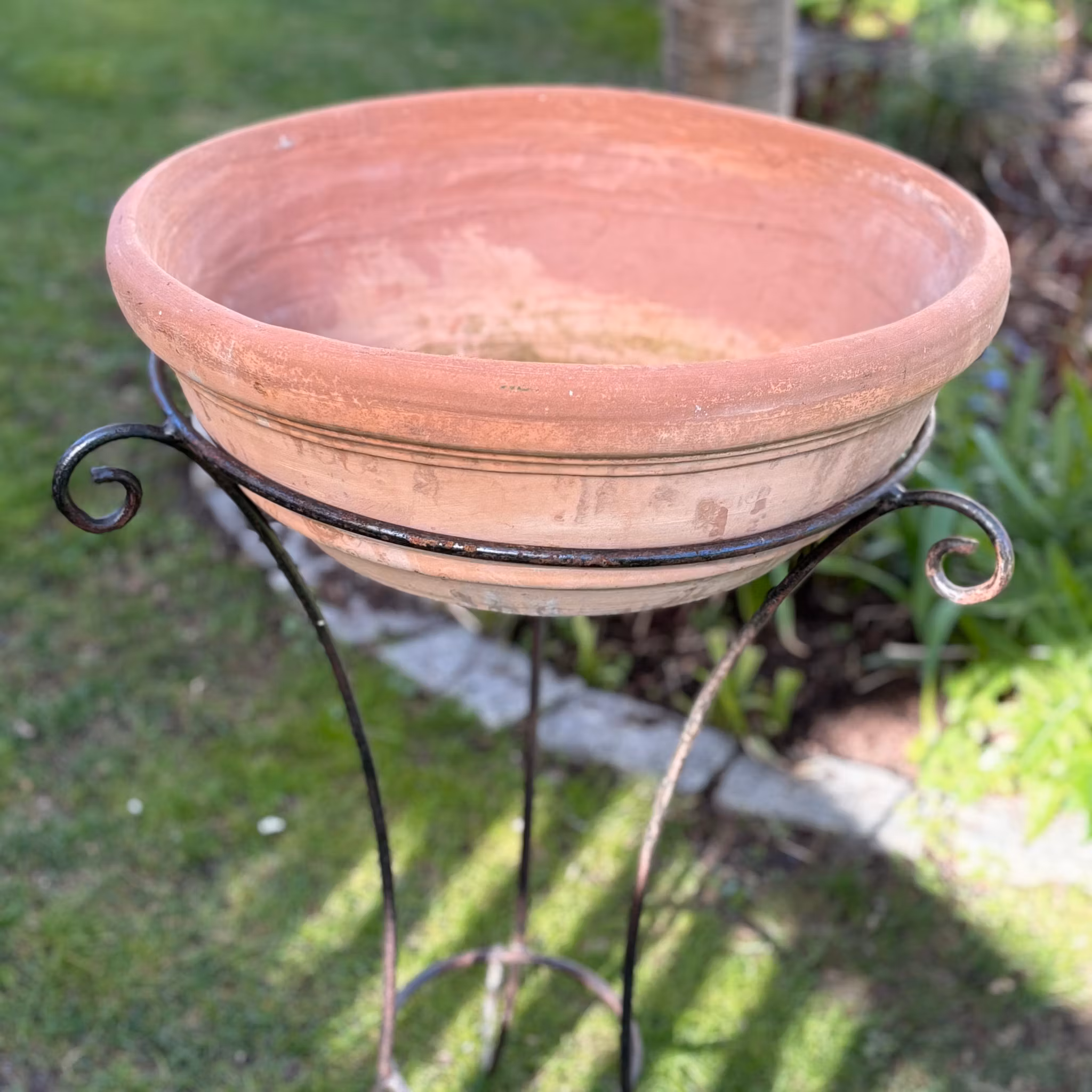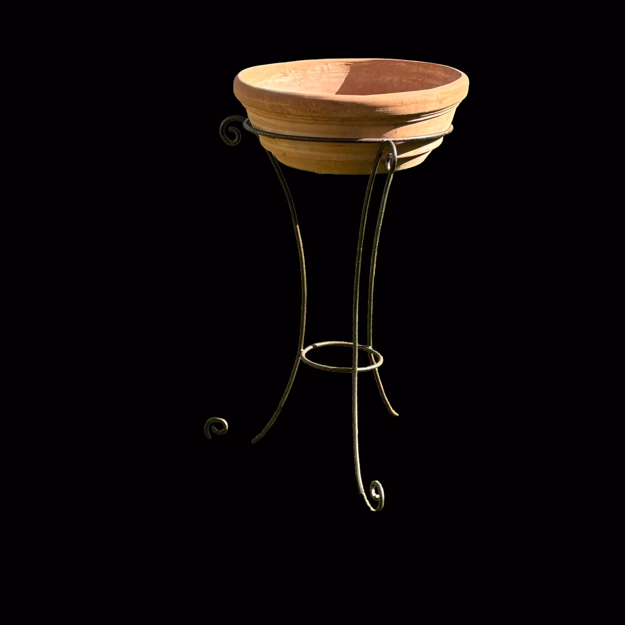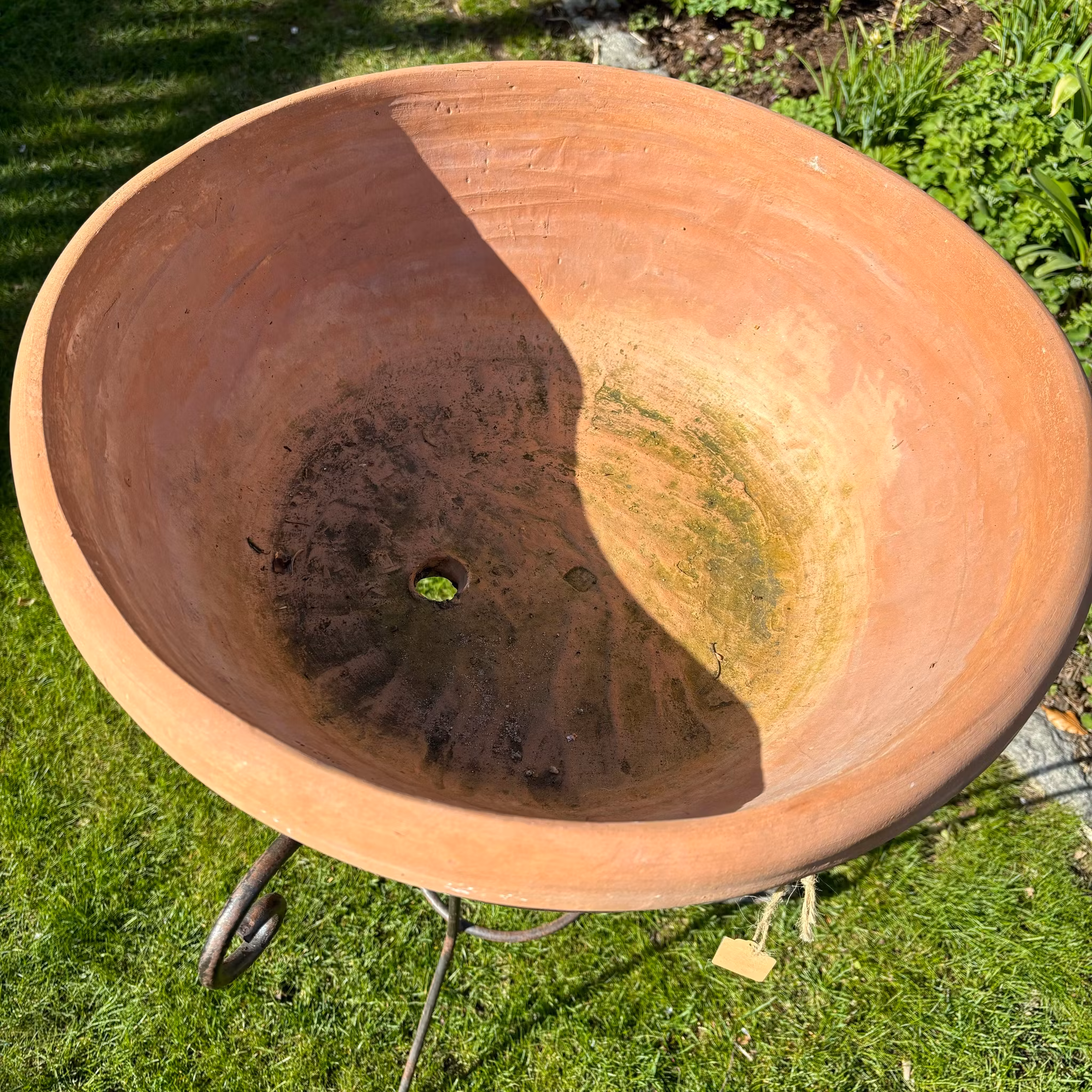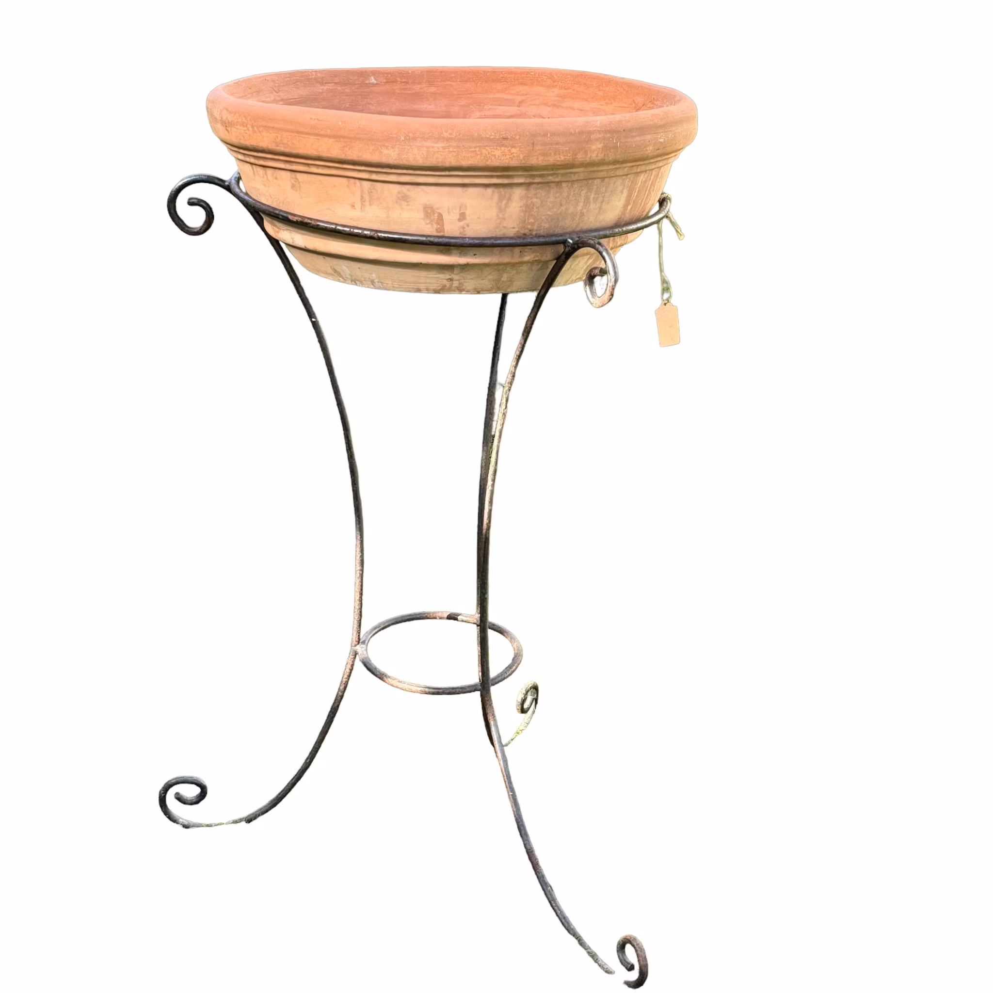 Skapa ett riktigt vackert och unikt arrangemang i trädgården, på altanen eller uterummet med denna smidesställning med tillhörande keramikkärl i terrakotta. Kärlet har ett hål i botten och är av en rejäl storlek Här kan du plantera massor av fina sommarblommor. Som ni ser på bilderna är den av äldre modell och i använt skick, inga skador. Inropad på auktion.